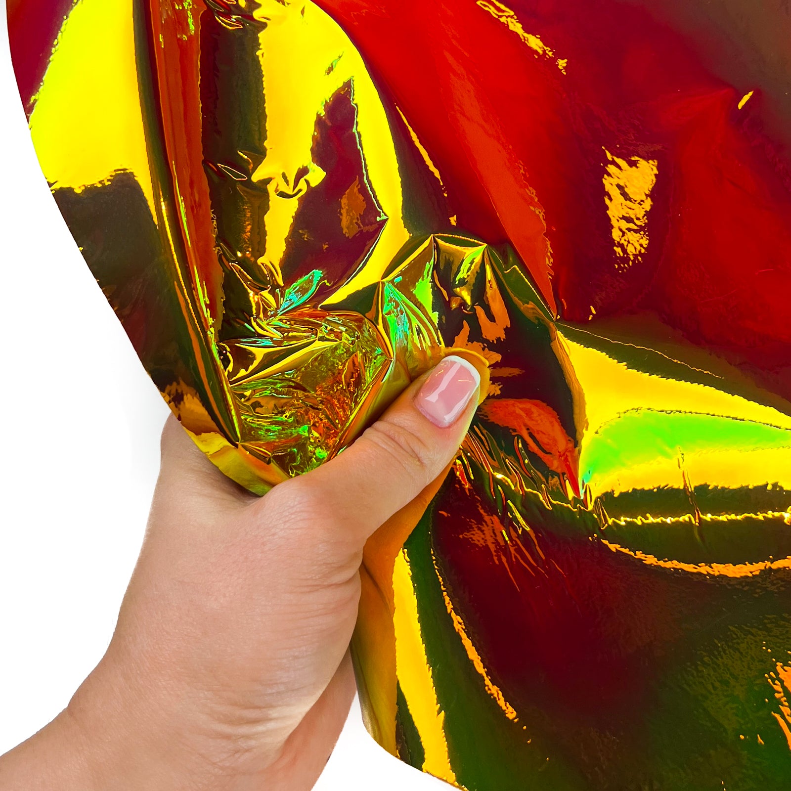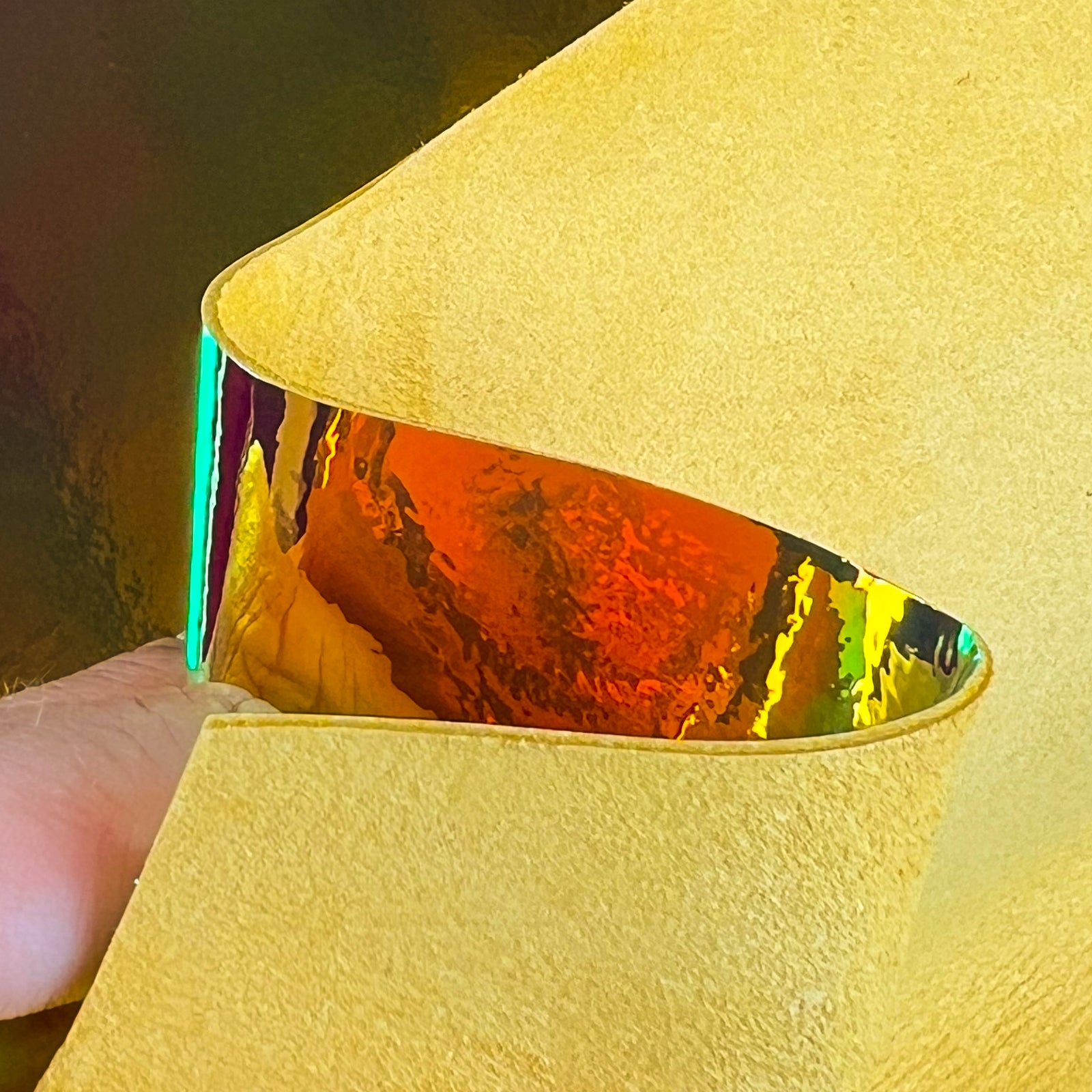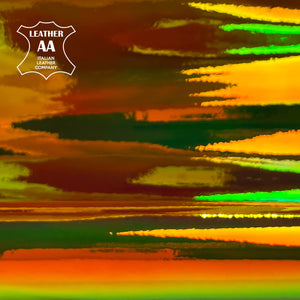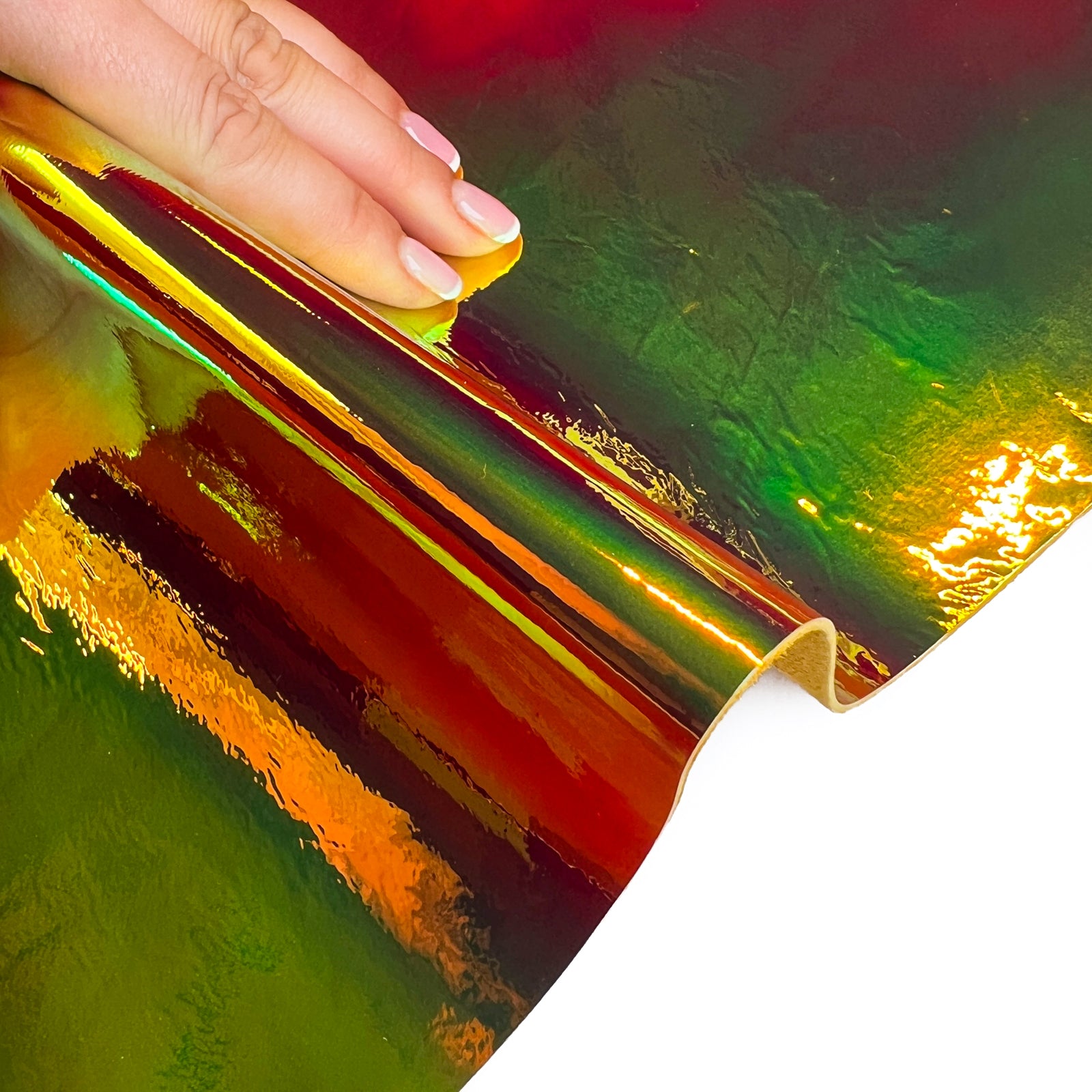 Various metallic yellow, green, and red leather holographic colors. Shiny mirror effect. Need to be careful with folding - can leave visible marks.