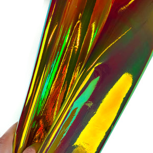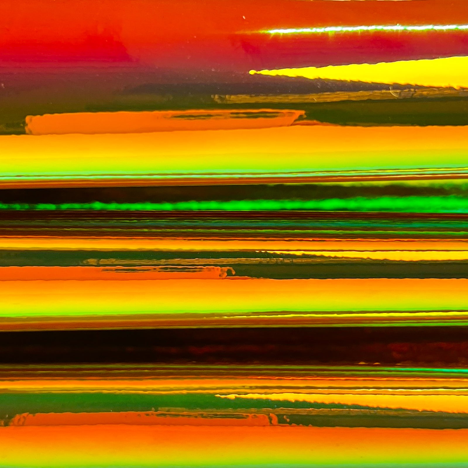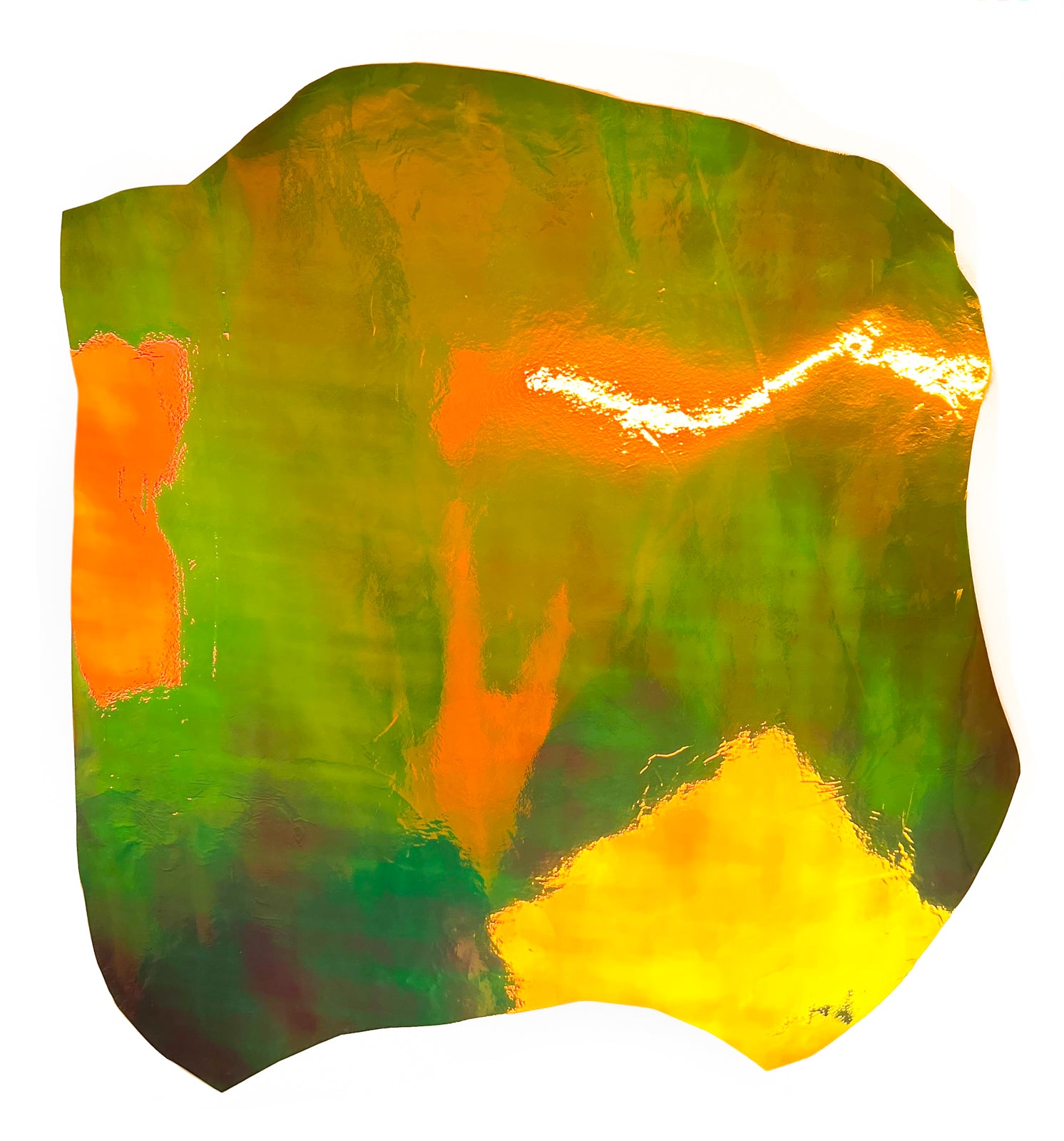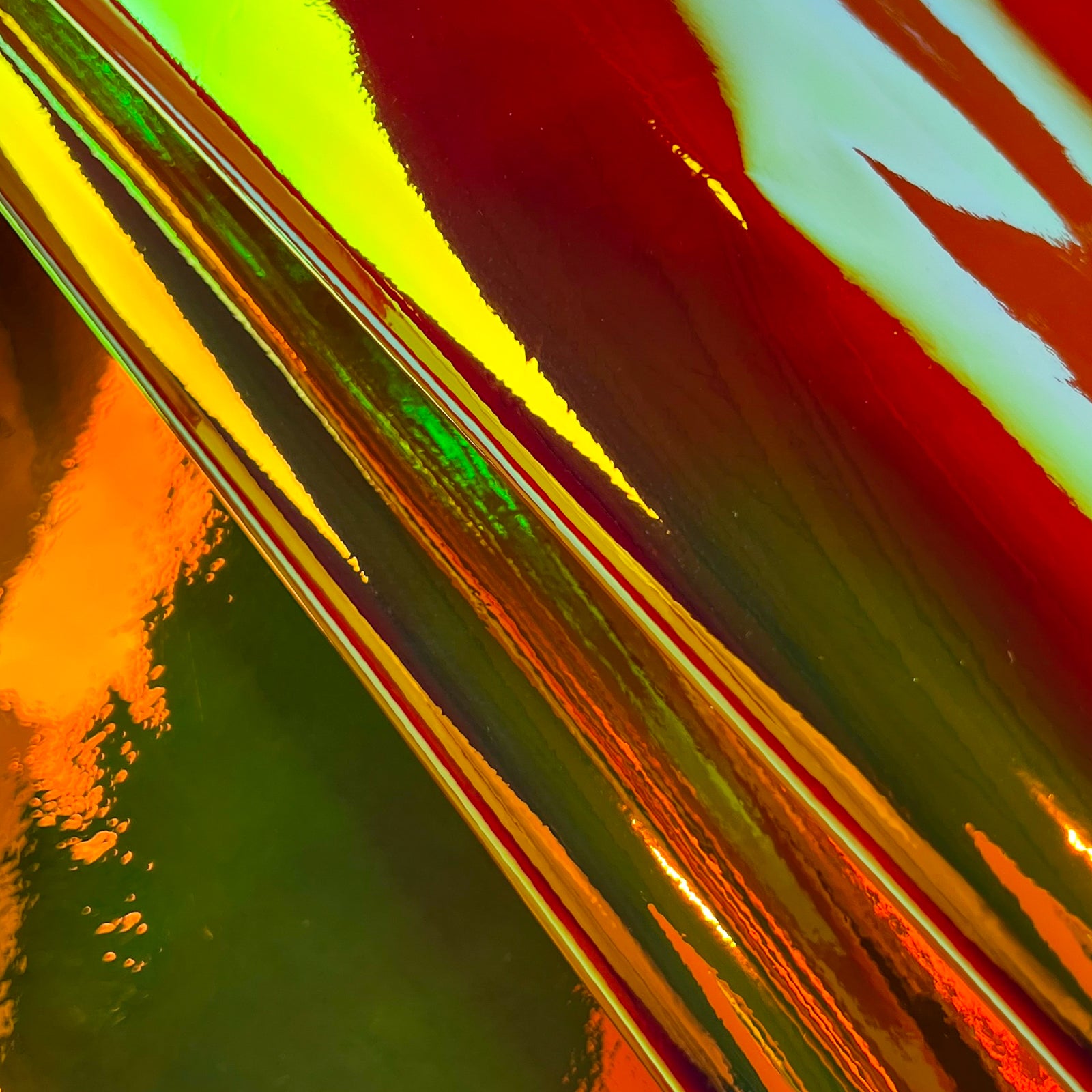 Various metallic yellow, green, and red leather holographic colors. Shiny mirror effect. Need to be careful with folding - can leave visible marks.