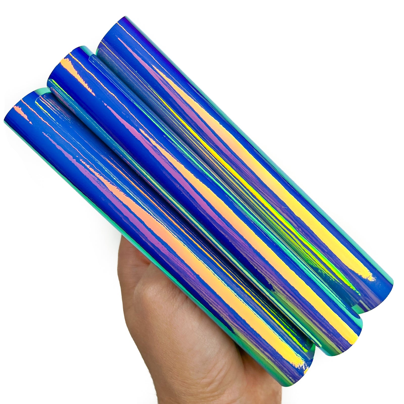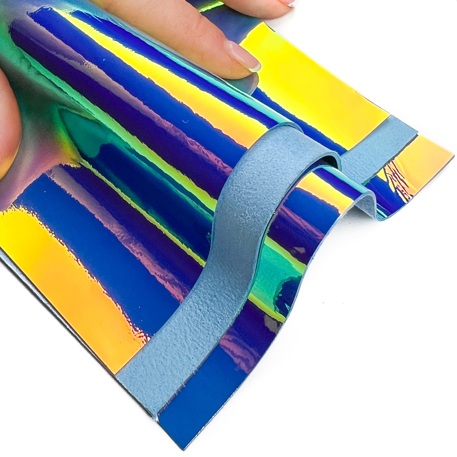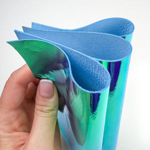Bright Various metallic blue, purple and orange leather holographic colors. Shiny mirror effect sheets. Need to be careful with folding - can leave visible marks.
