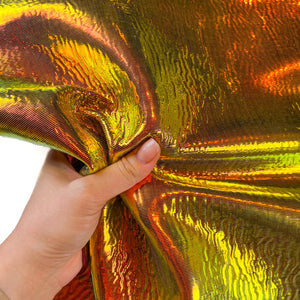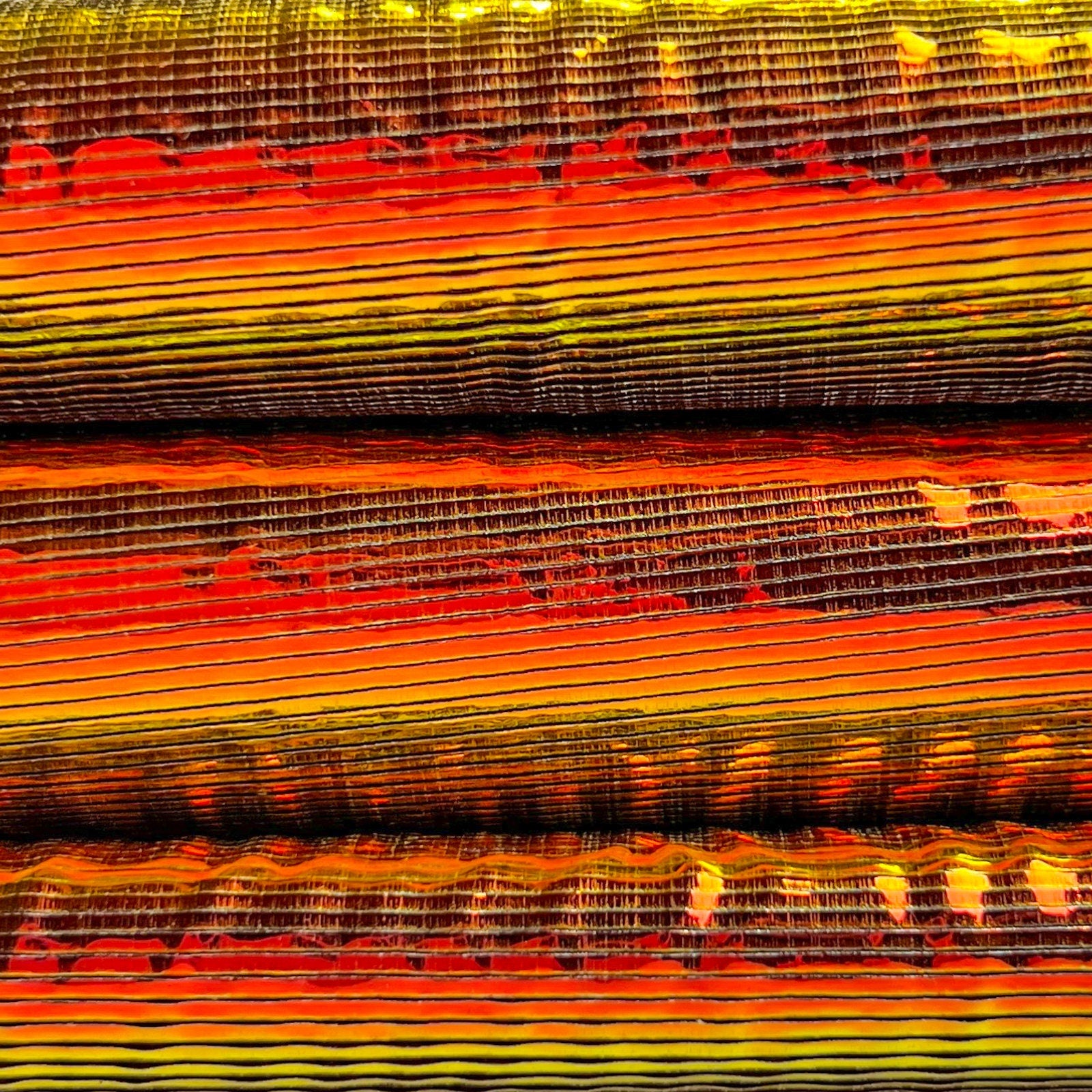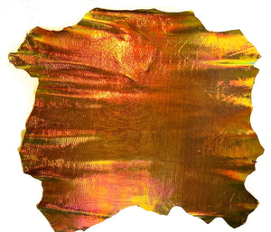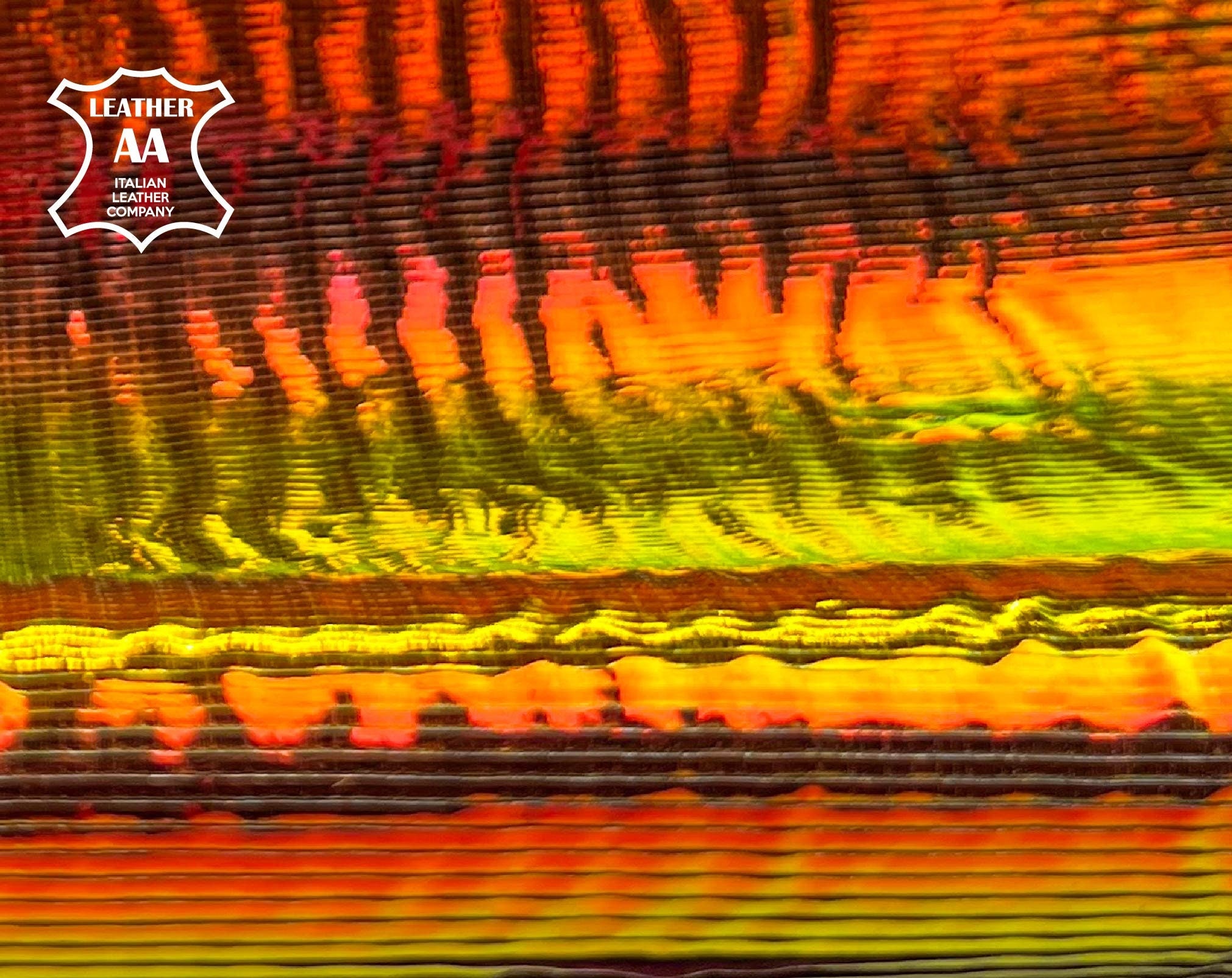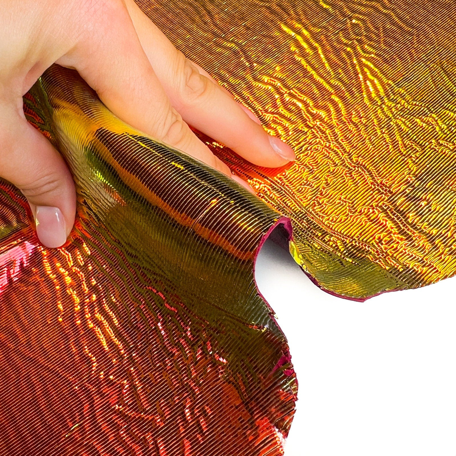 A hologram is definitely the trend of 2023! Bright hologram leather pieces. Glossy purple and yellow holographic shades all over leather. Genuine lambskin hides with embossed lines. The backside is red. Amazing leather for bag and purse crafters will be long-lasting. Our mission is to provide only the highest quality Italian leather to other leather workers, crafters of all kinds, small businesses, or shops for your own projects.