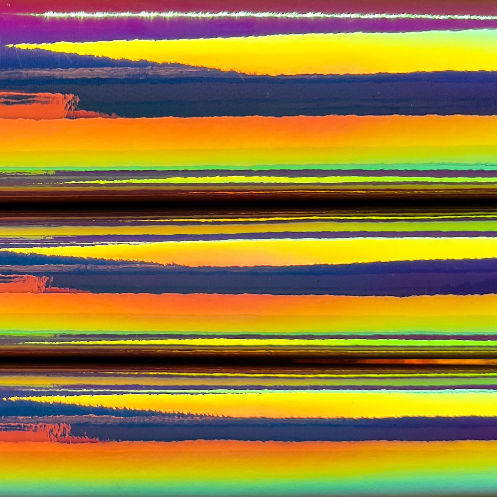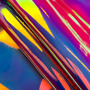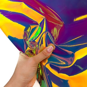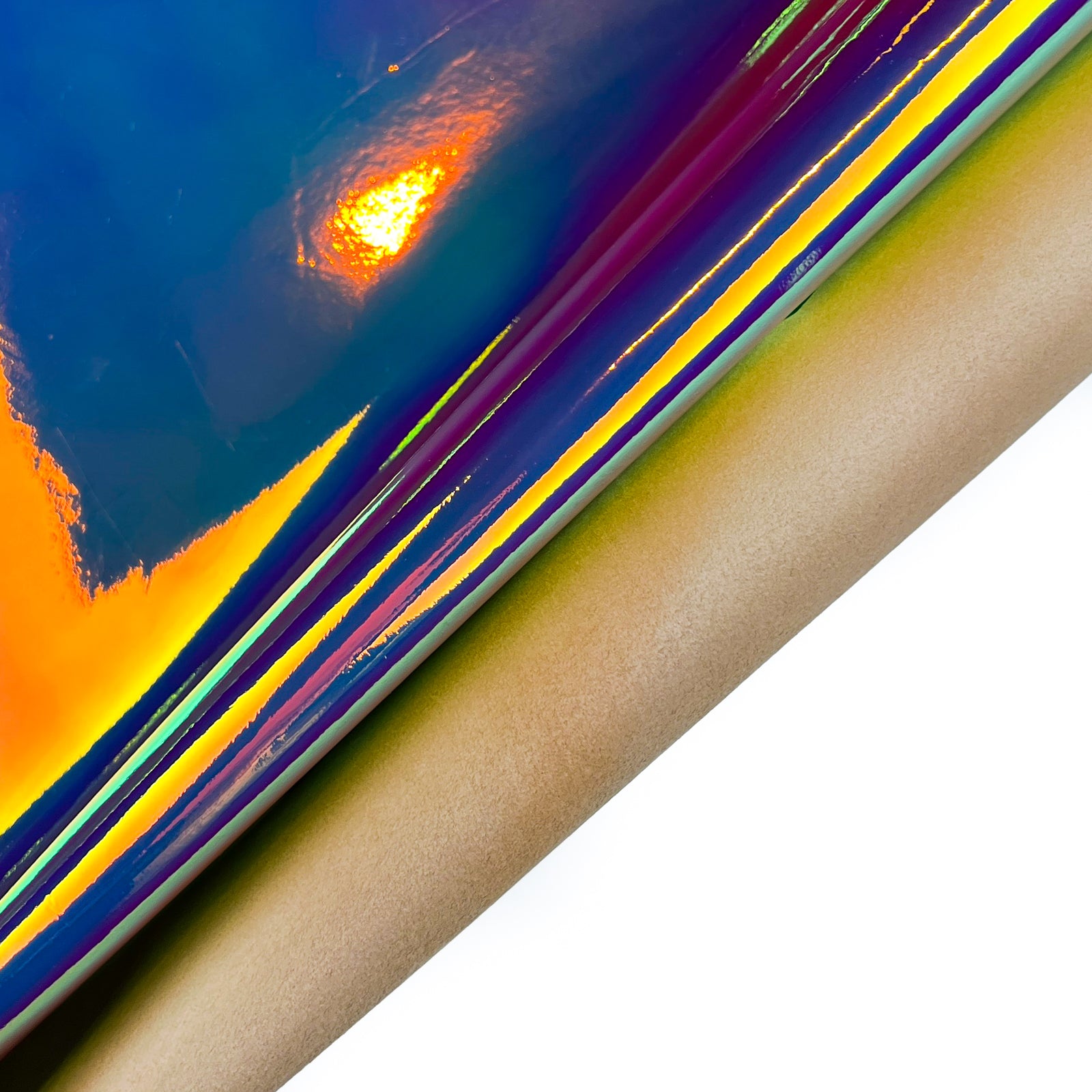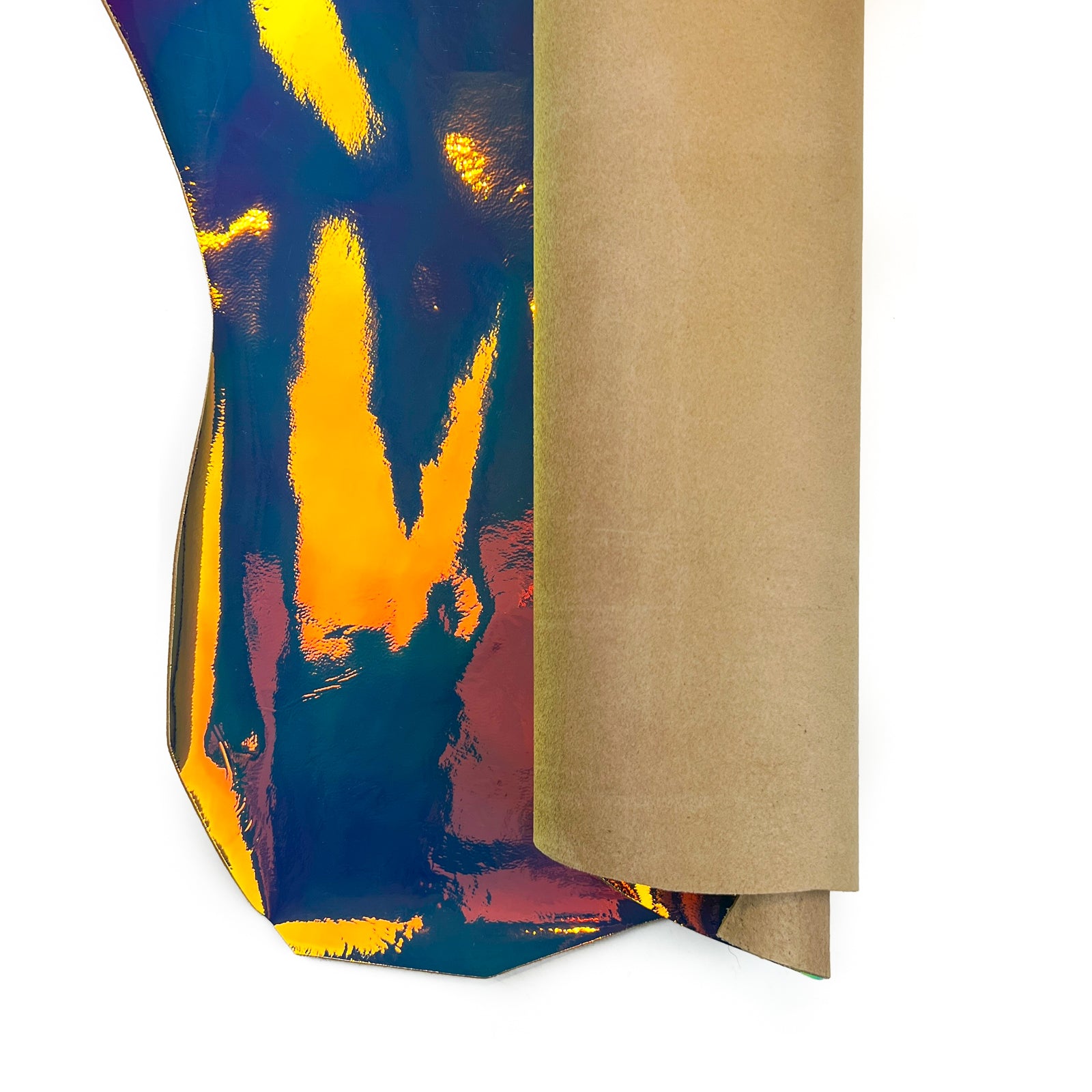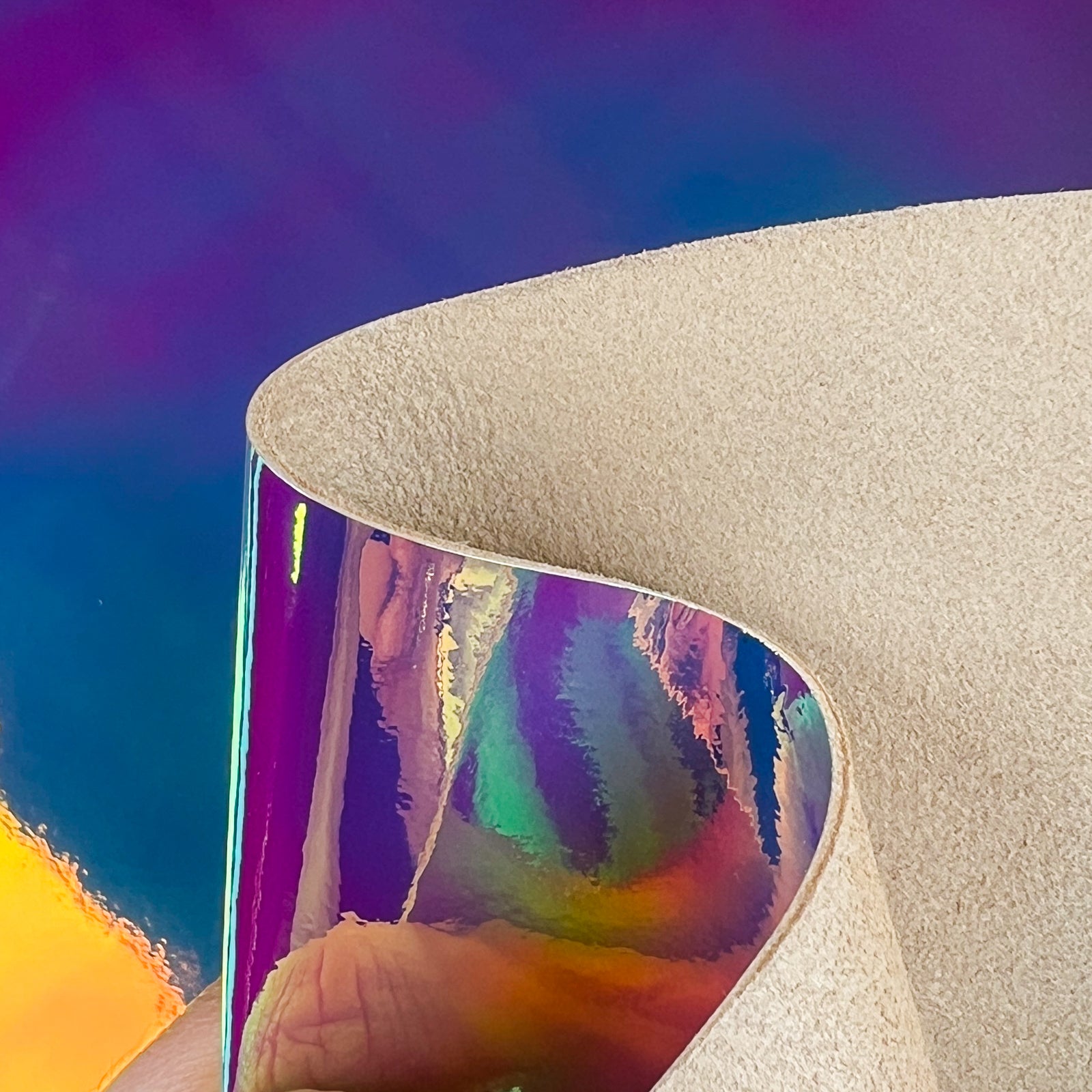 Bright Various metallic purple, blue and pink leather holographic colors. Shiny mirror effect. Need to be careful with folding - can leave visible marks.