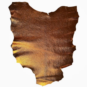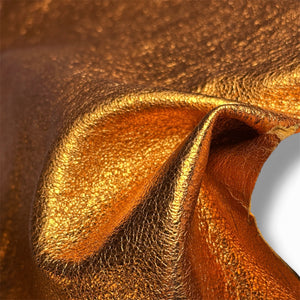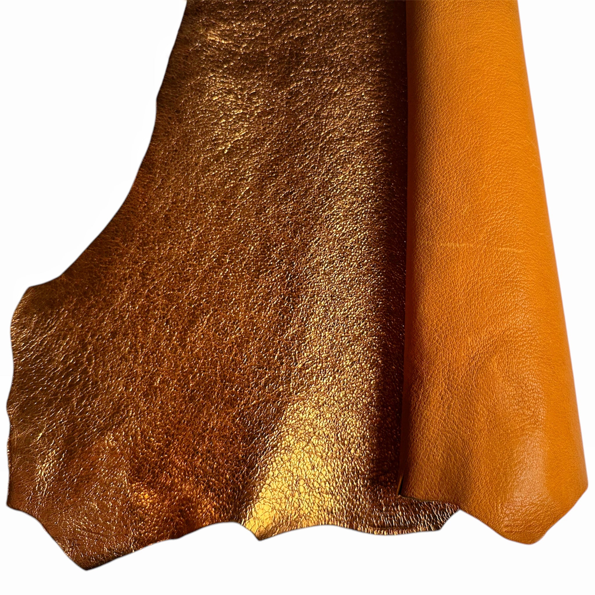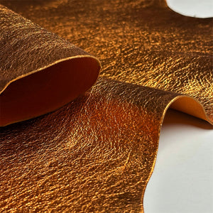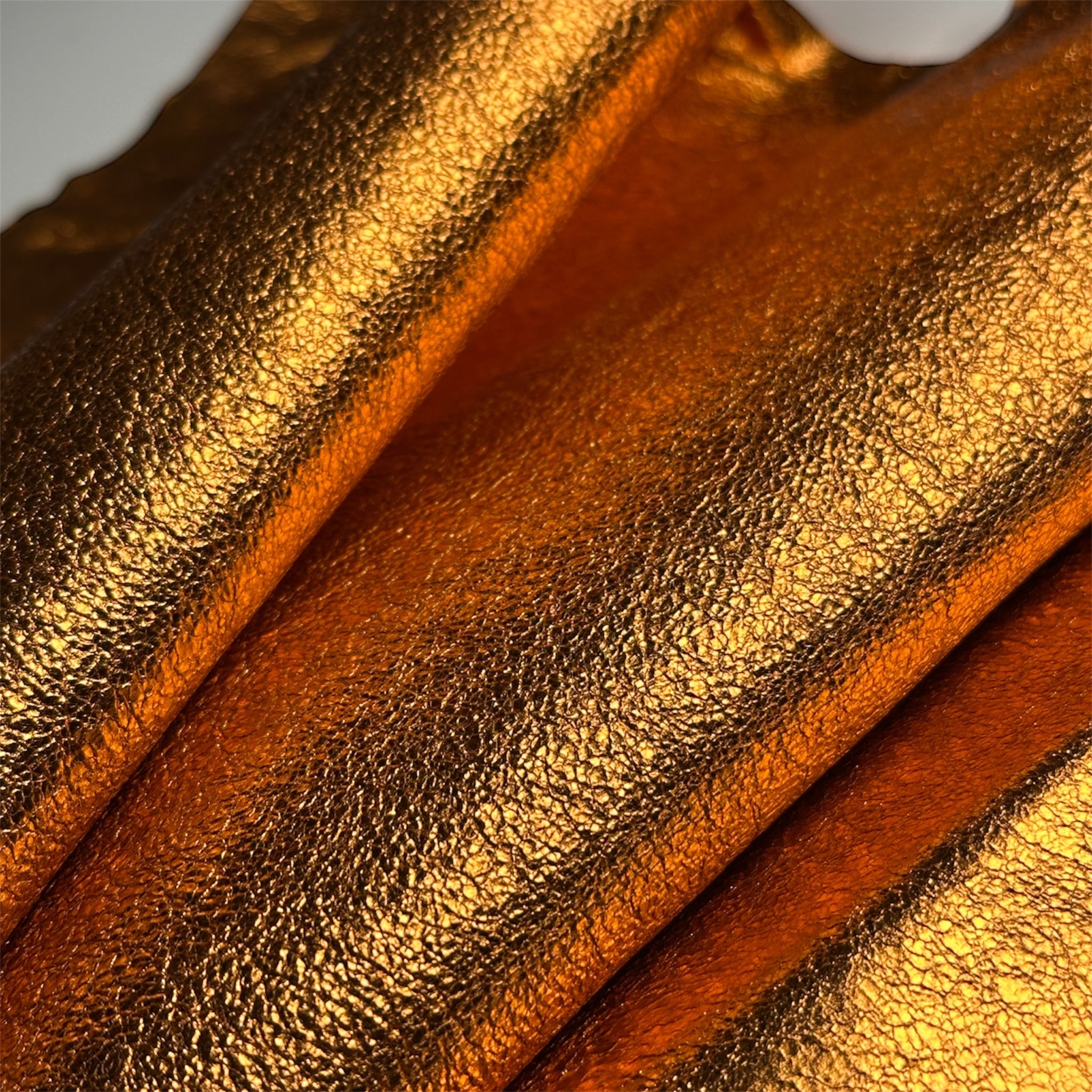 Crunchy Textured Lambskin Pieces. Metallic oramge with broze. Italian fabric. Amazing leather for bag and purse crafters will be long-lasting. Our mission is to provide only the highest quality Italian leather to other leather workers, crafters of all kinds, small businesses, or shops for your projects.