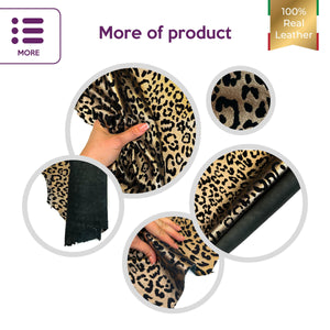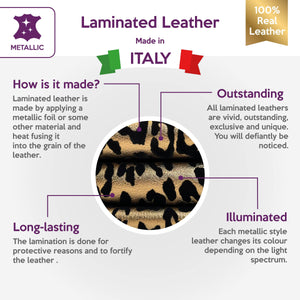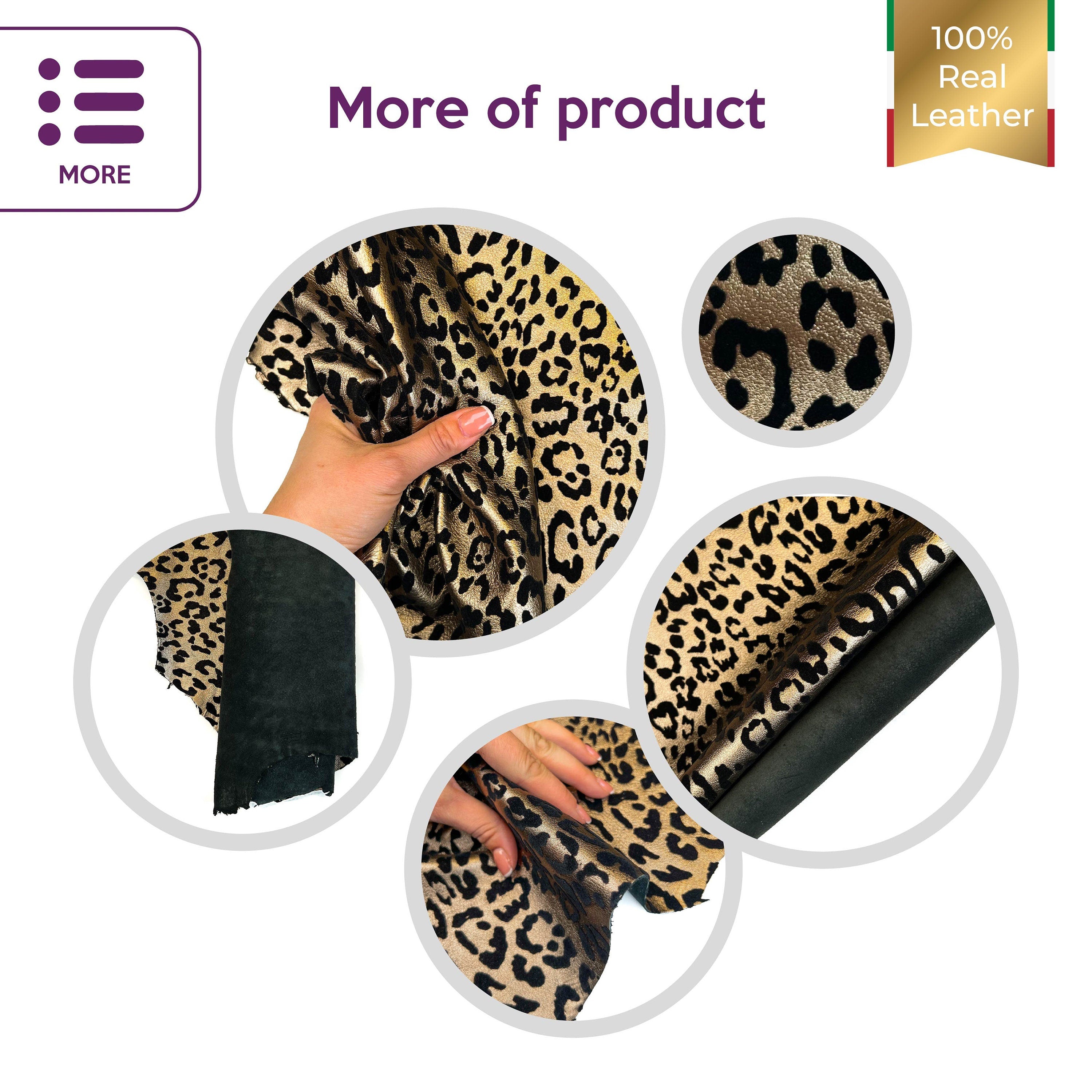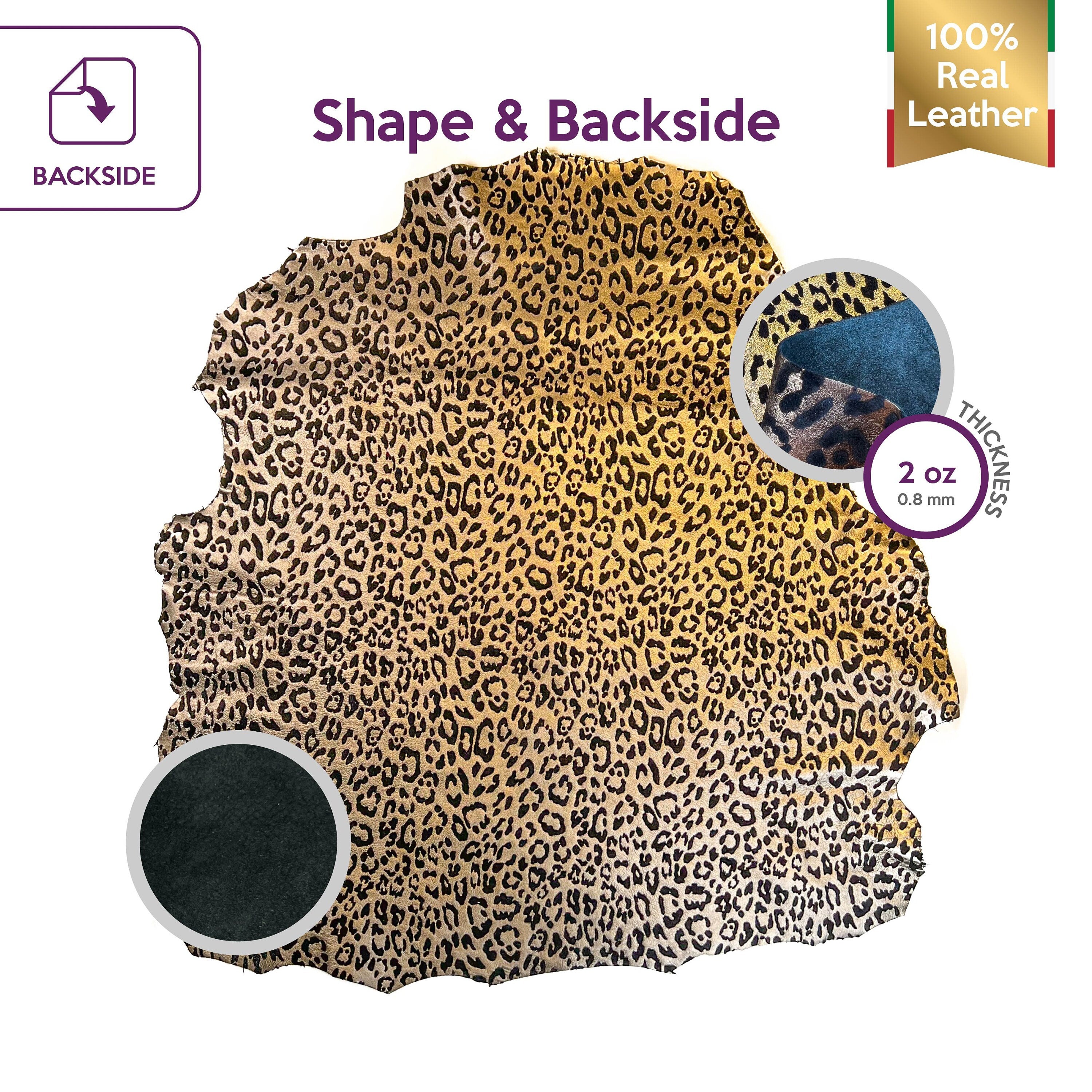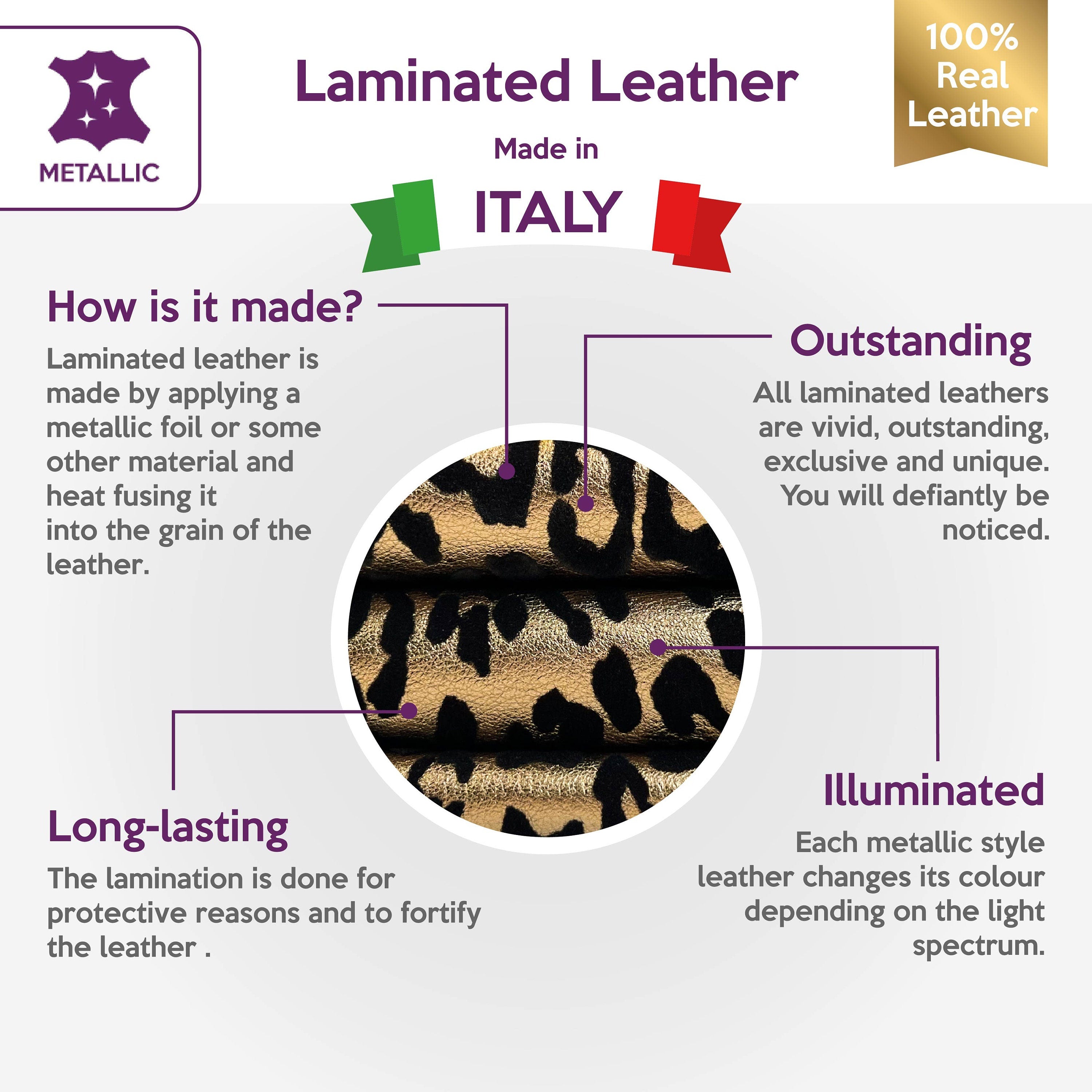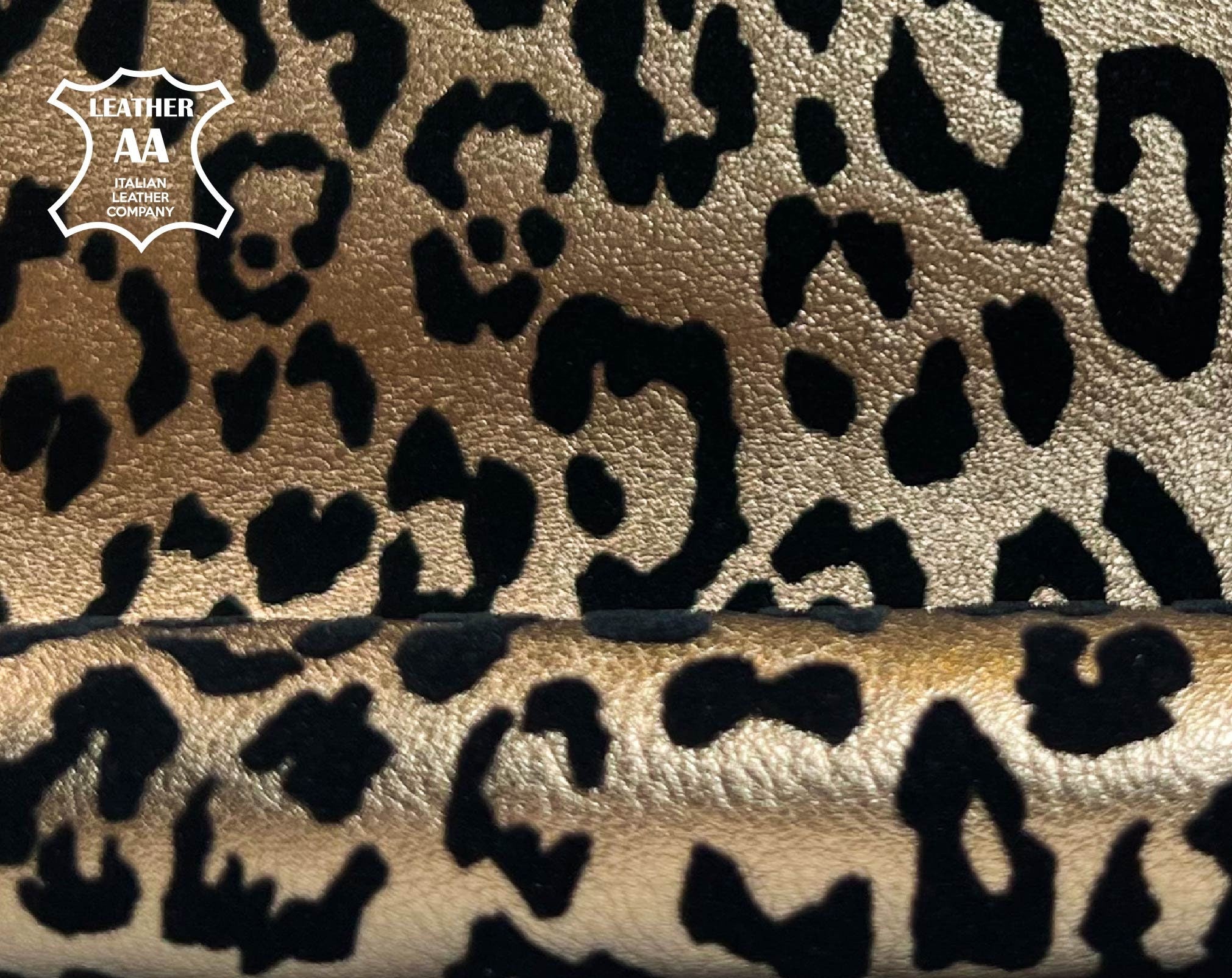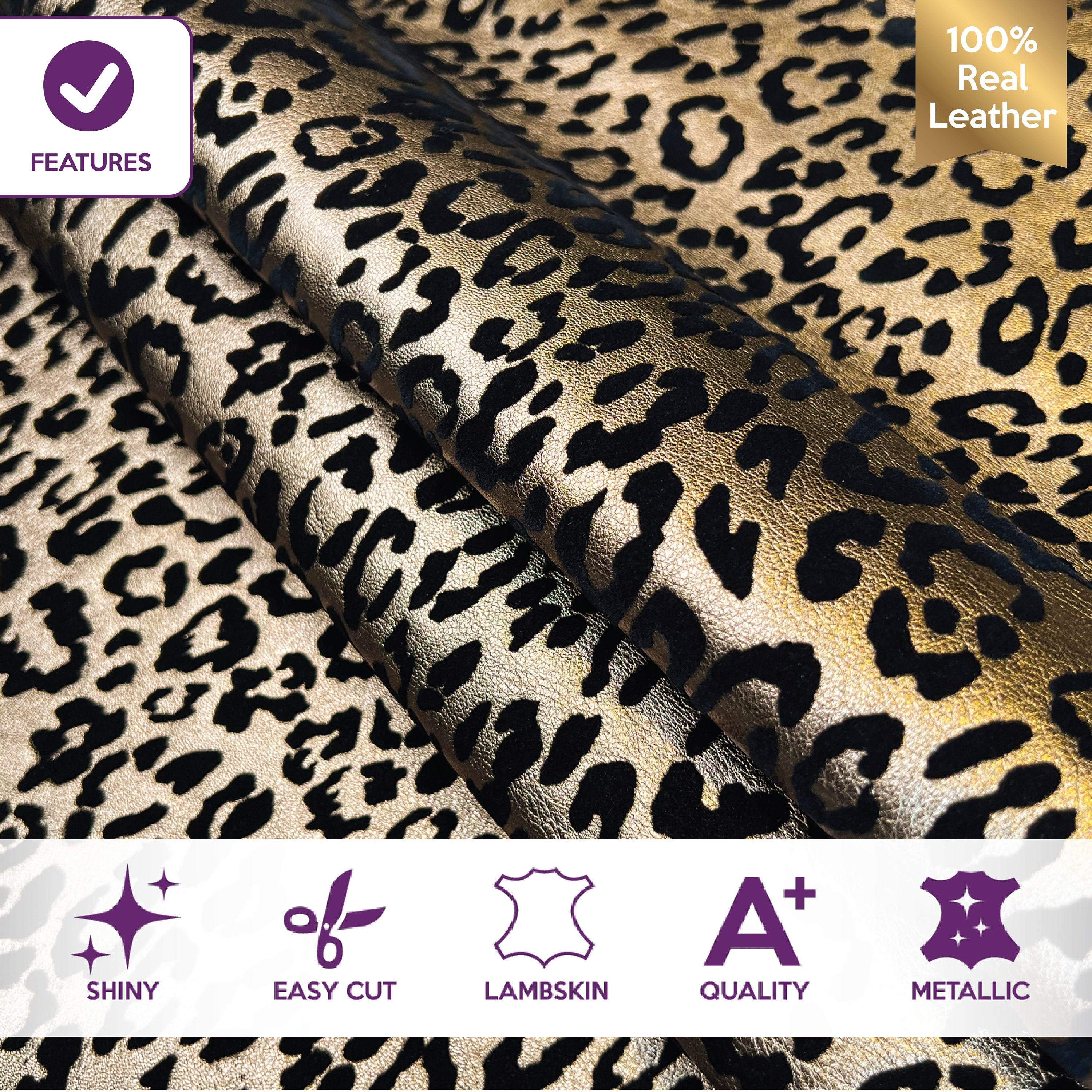 - Metallic lambskin leather with leopard print. Soft velour leather is very easy to work with. Perfect for leather accessories. The backside is washed black. Thickness 0.8 mm / 2 oz