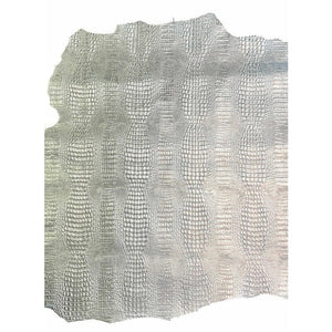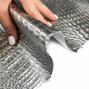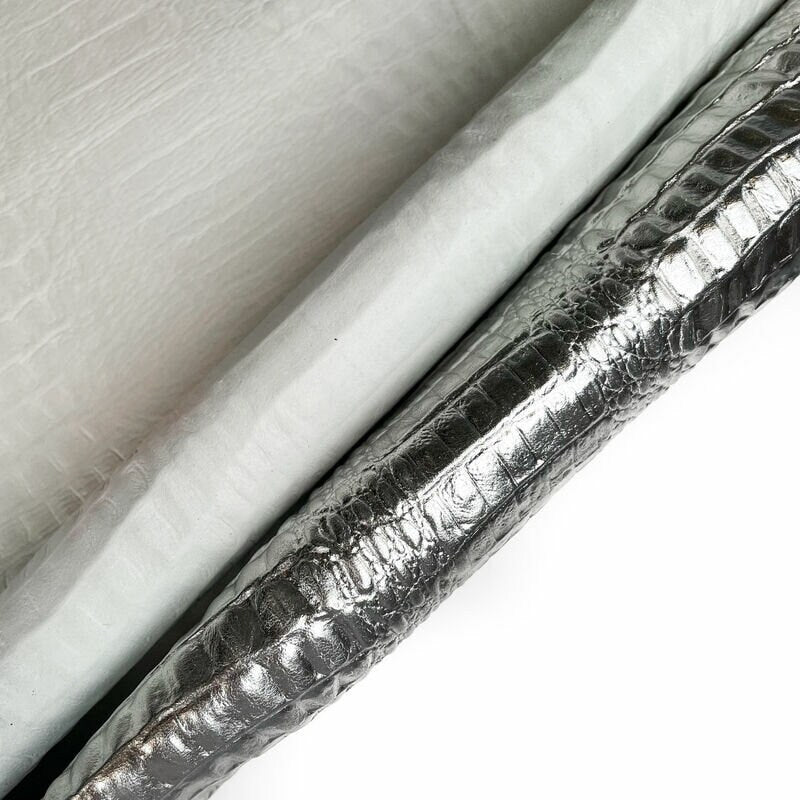 - Silver sheepskin leather with crocodile print. Crafting pieces for sewing. Perfect embossed leather for jewelry. DIY leather.