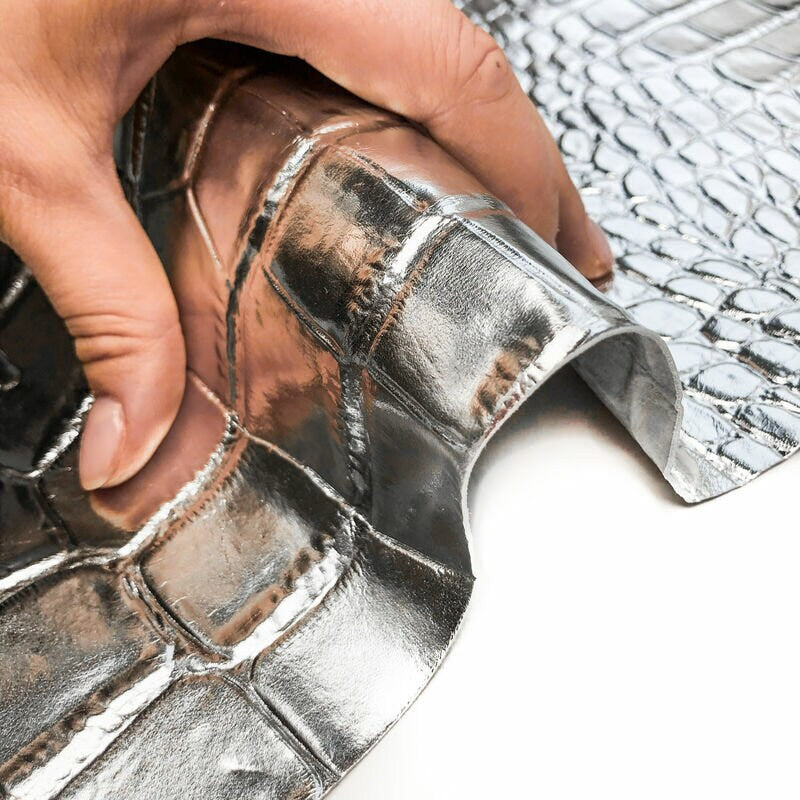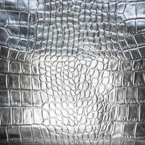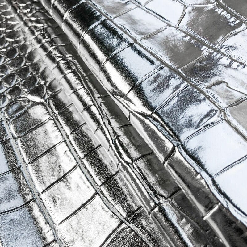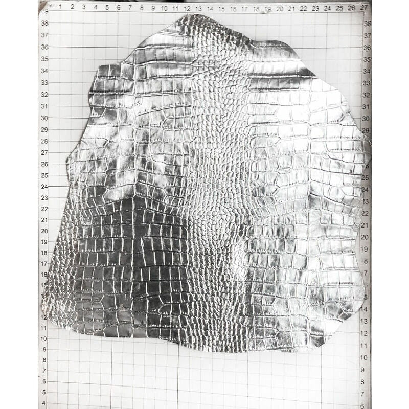 - Silver sheepskin leather with crocodile print. Crafting pieces for sewing. Perfect embossed leather for jewelry. DIY leather.