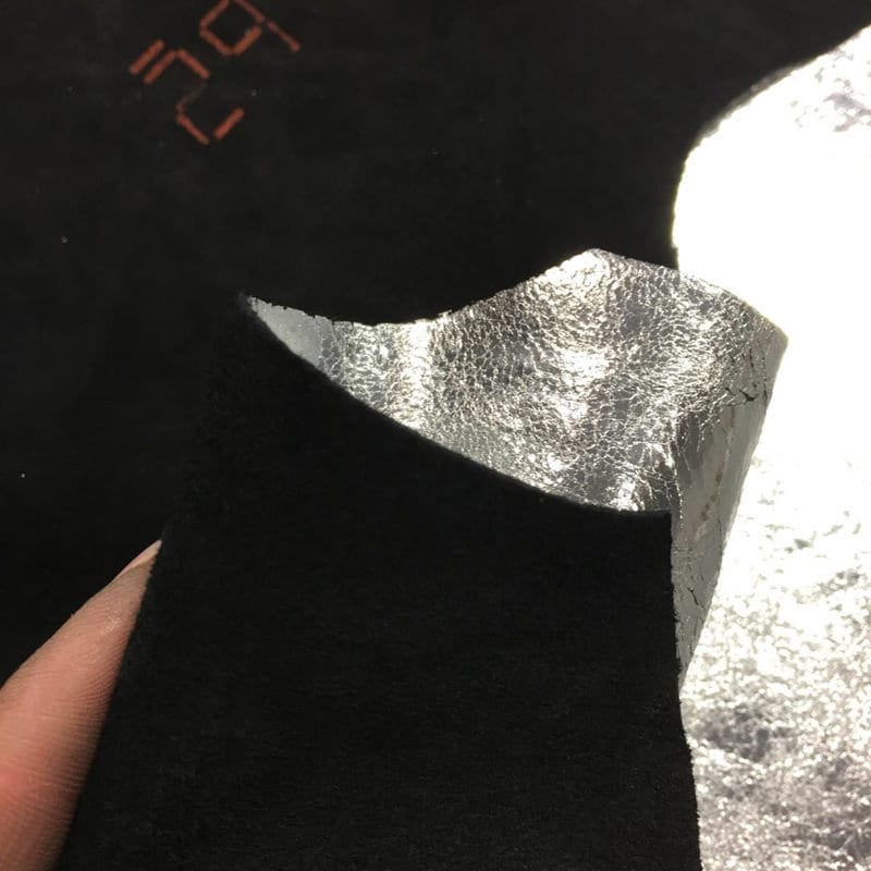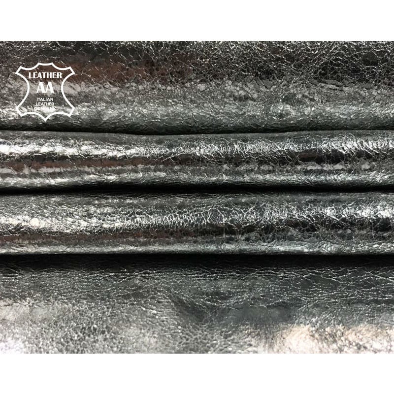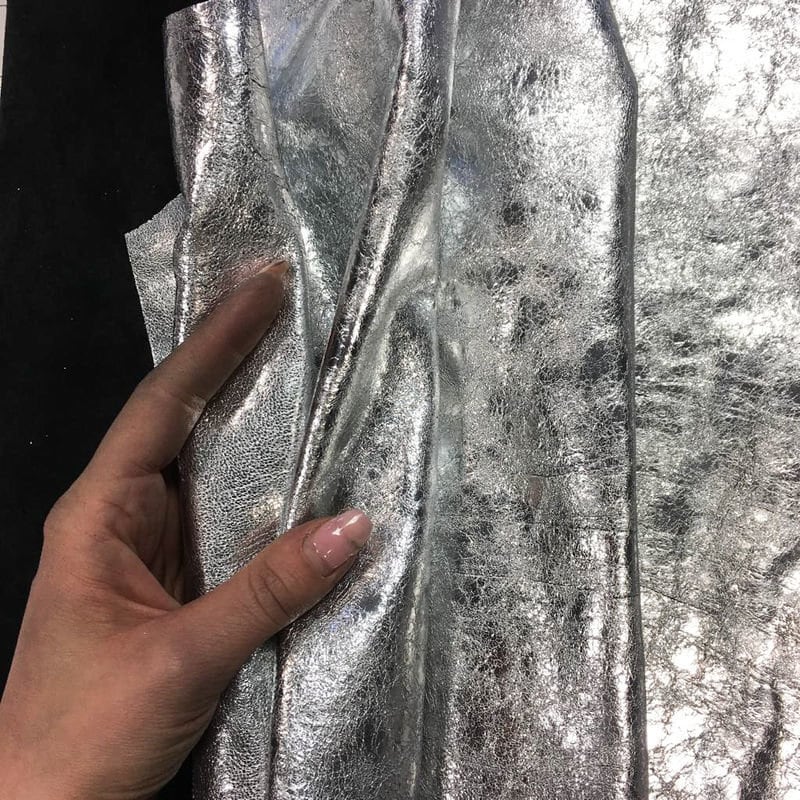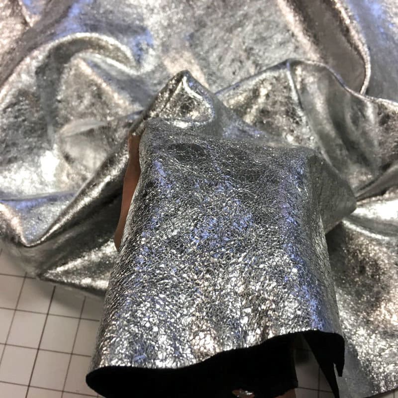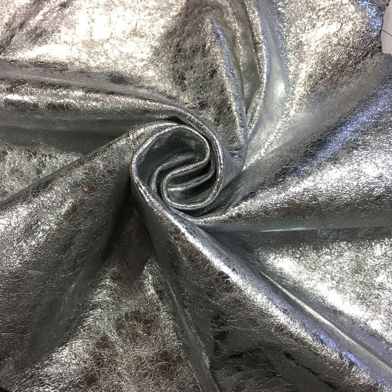 -SILVER leather fabric, Genuine Lambskin Leather for sewing. Thick Crunchy silver Metallic Leather material. Shinny metallic leather print. Italian quality leather for handcrafting, shoe making and sewing in general. Fantastic textured silver leather. Gorgeous Leather print. Try it!