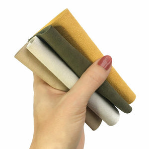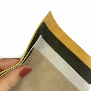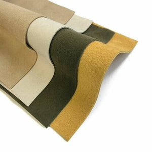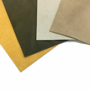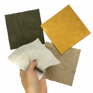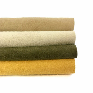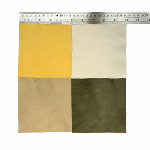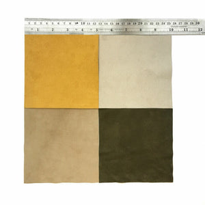 FOUR Pre-cut leather Sheets : 1 mineral yellow suede, 1 white suede piece, 1 khaki green suede piece and 1 brown suede piece.