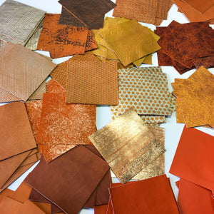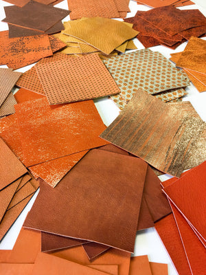Colors: perforated, different metallic, textured leather, suede, nappa skin, leather prints etc (There are NO two IDENTICAL scrap packs, each pack is different, there may be some similarities, but they WON'T be 1:1)