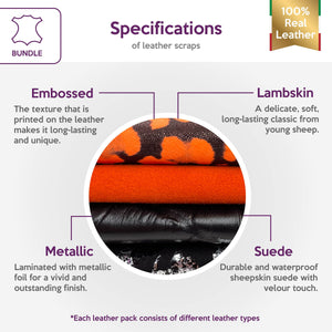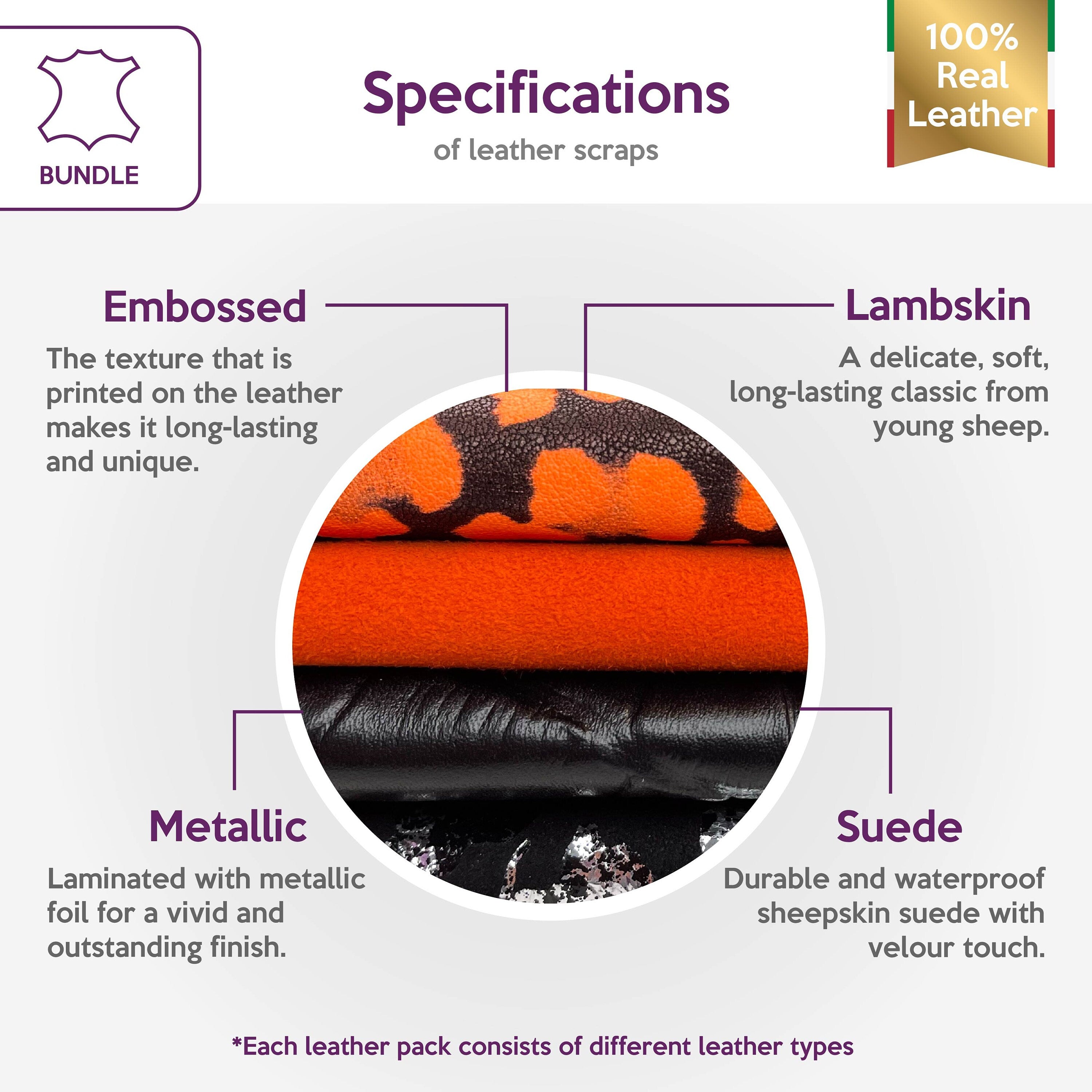 High-quality lambskin leather bundle of 4. Includes the softest sheepskin leather, the brightest neon lambskin, and unique embossing.