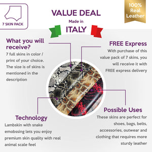 LIMITED VALUE DEAL. Purchase a bundle of 7 full hides with 30% OFF regular price if you are buying only one skin of your favorite lambskin leather with snake print and...