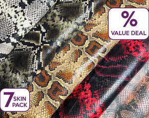 LIMITED VALUE DEAL. Purchase a bundle of 7 full hides with 30% OFF regular price if you are buying only one skin of your favorite lambskin leather with snake print and embossed scales. All 7 skins will be exactly the same color of your choice.