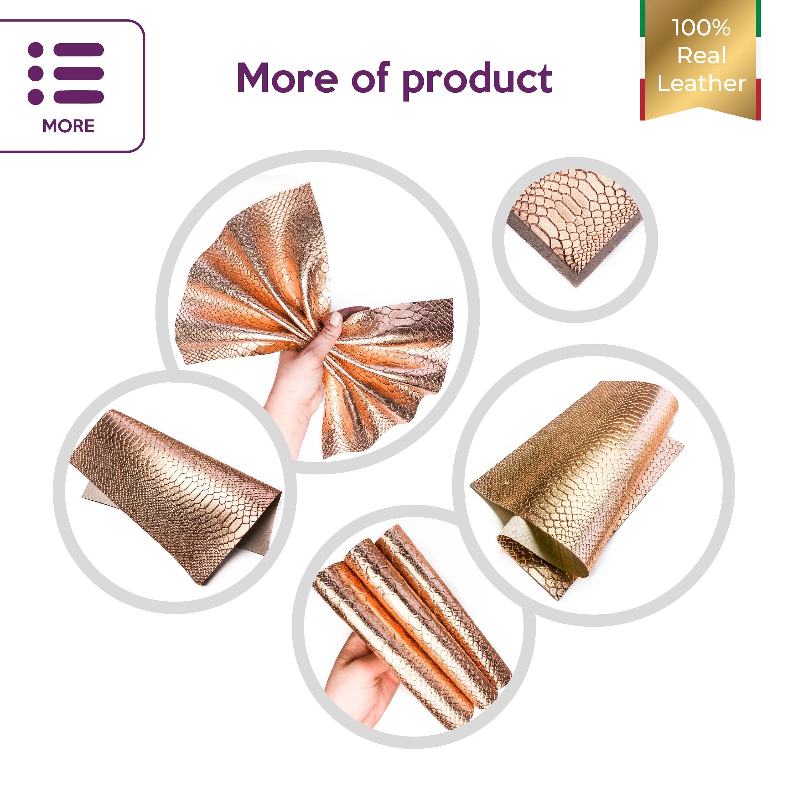 High-quality calf leather sheets with snake print. Rose gold pieces with shiny polished python texture for your best projects! Our mission is to provide only the best quality Italian leather samples to other leather workers, crafters of all kinds, small businesses or Etsy shop for your own projects.