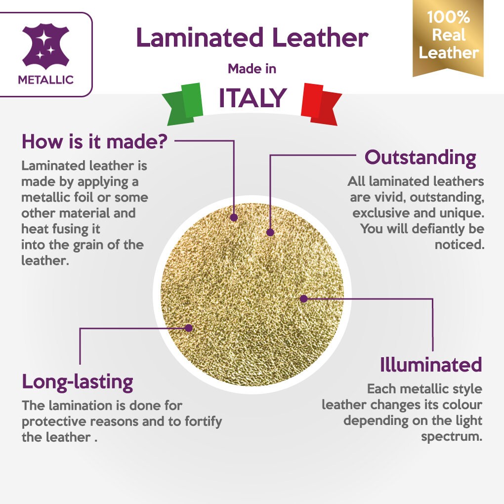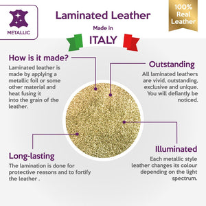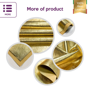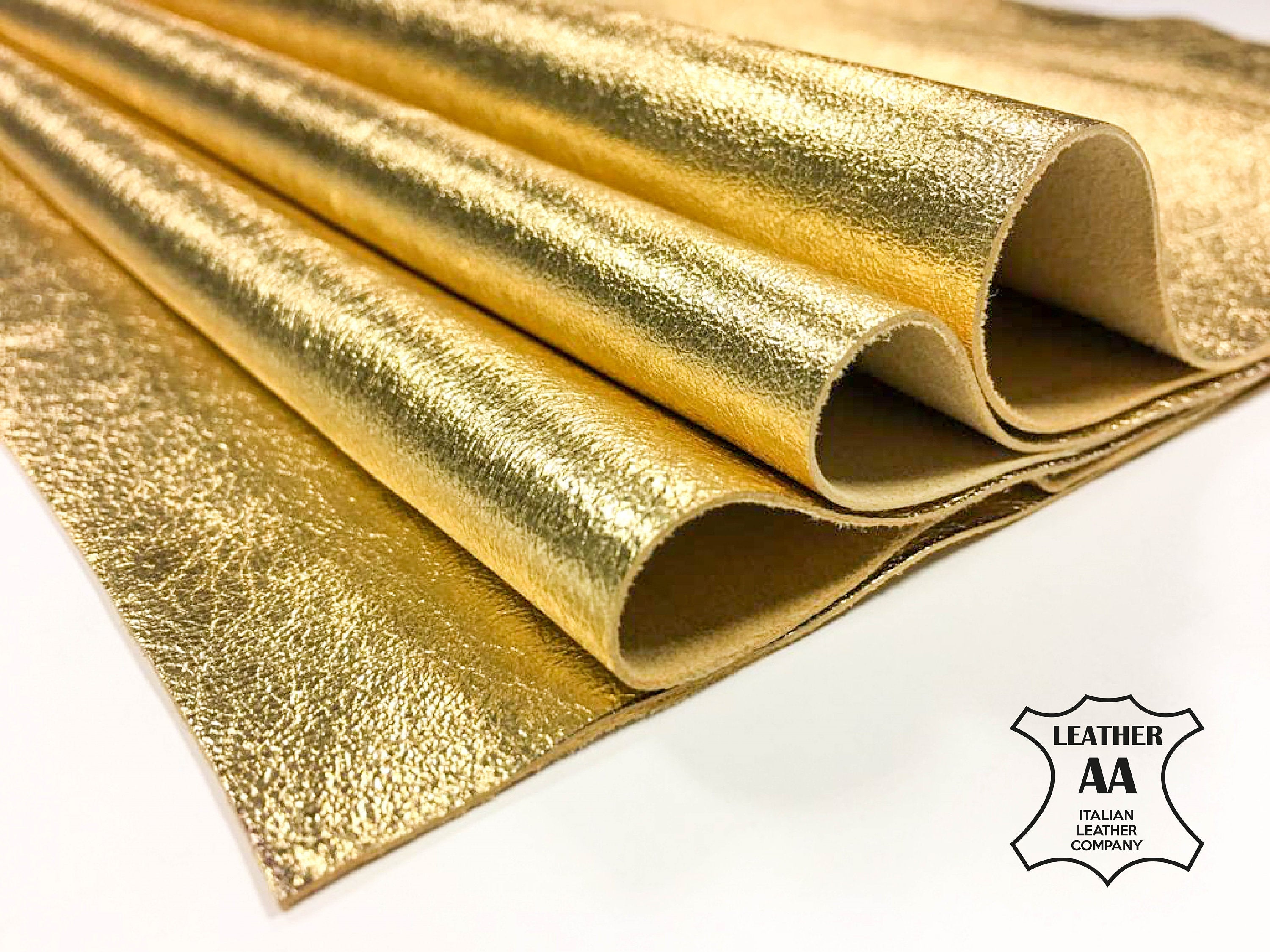 High-quality metallic lambskin leather fabric sheets in gold color. Shiny metallic leather pieces for your best projects! Our mission is to provide only the best quality Italian leather to other leather workers, crafters of all kinds, small businesses or Etsy shop for your own projects.