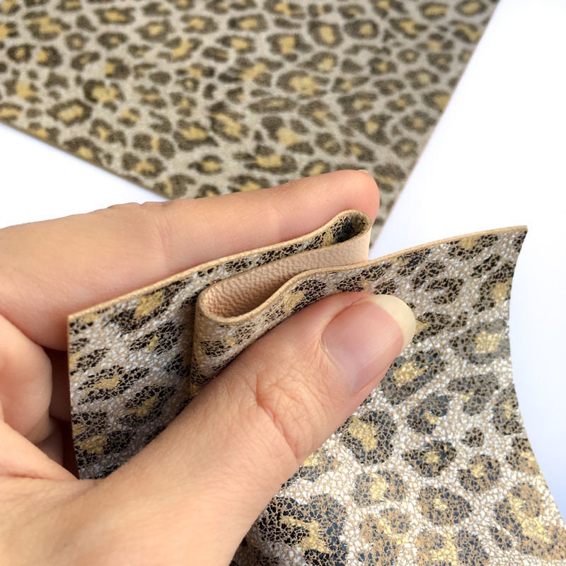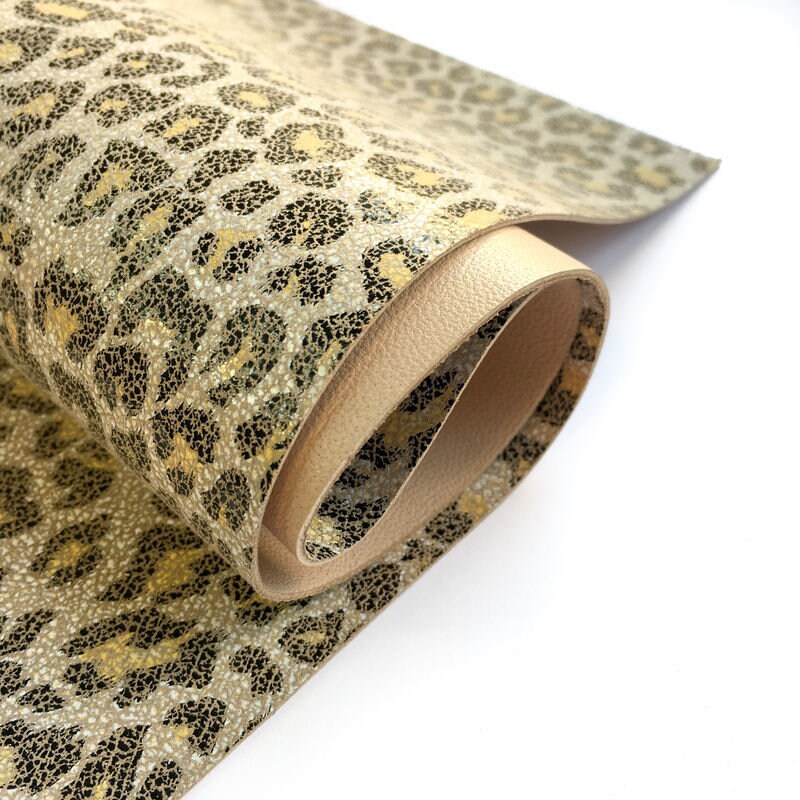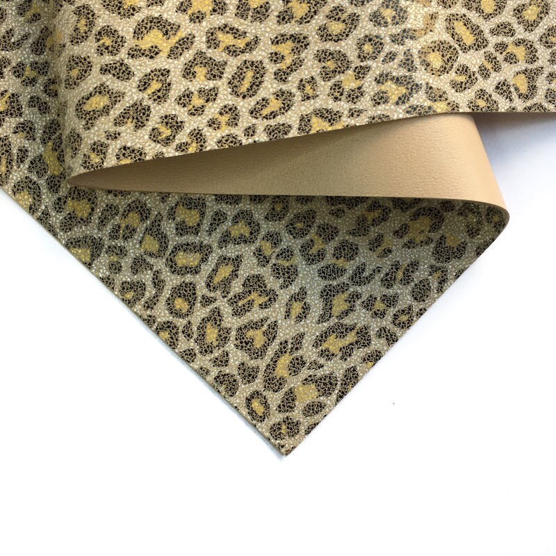 -Shiny Leopard print with crackle effect. Beautiful and shiny leather print. Backside in nice beige pink color. Glossy spot print gives it a feeling of texture/3d effect.