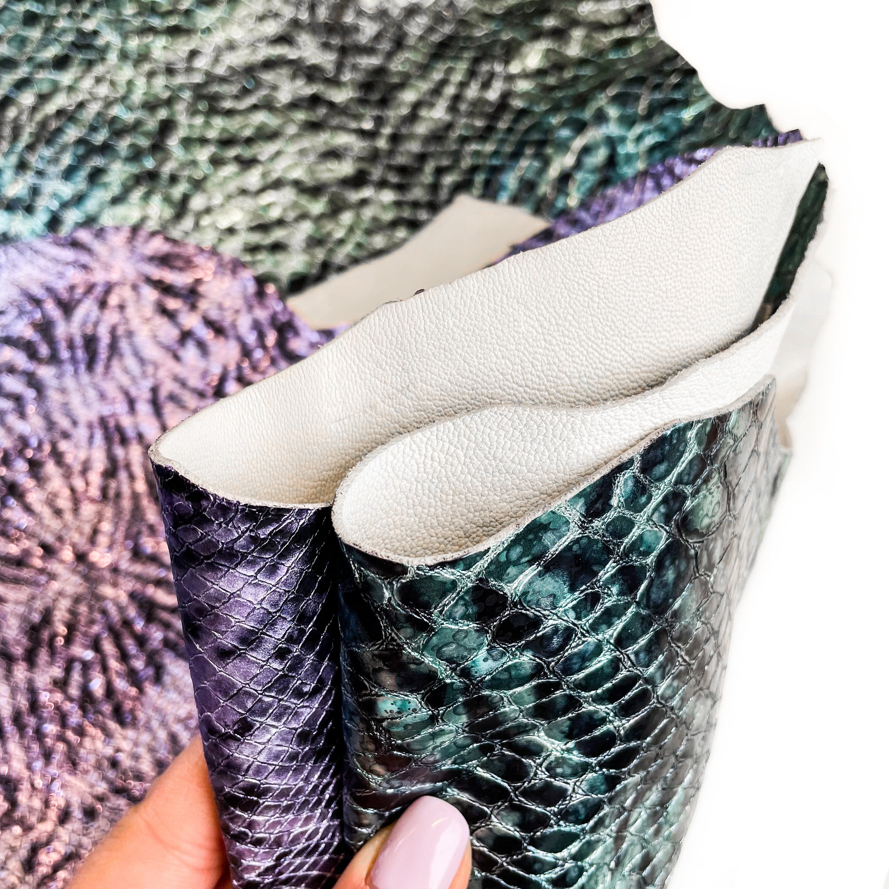 - Shiny metallic leather with zebra print. Snakeskin textured. Bit thick leather but will hold the shape.