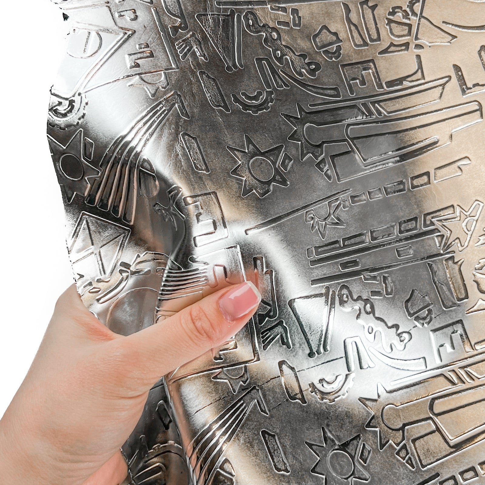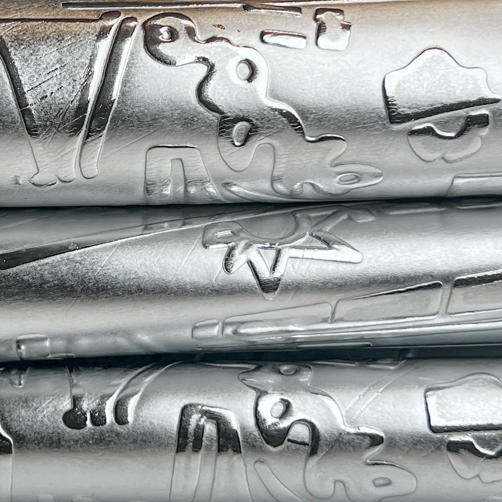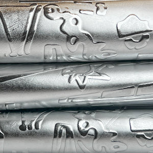 Quality matte silver lambskin leather with embossed space galaxy print. Shiny metallic textured hides. Amazing leather for bag and purse crafters will be long-lasting. Our mission is to provide only the highest quality Italian leather to other leather workers, crafters of all kinds, small businesses, or shops for your projects.