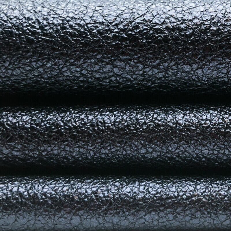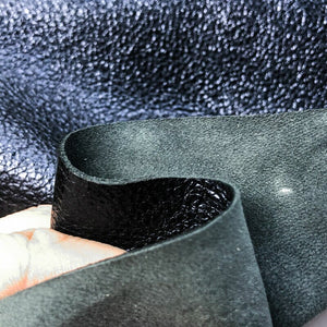 - Crunchy metallic foil leather pieces. Natural sparkly lambskin hides from the best Italian tannery. Perfect leather for sewing. Shiny navy leather for your best projects!