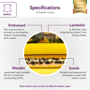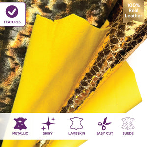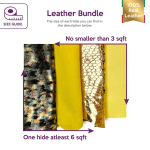 High-quality lambskin leather bundle of 4. Includes the softest sheepskin leather, yellow suede, metallic gold reptile print and unique green metallic forest print.