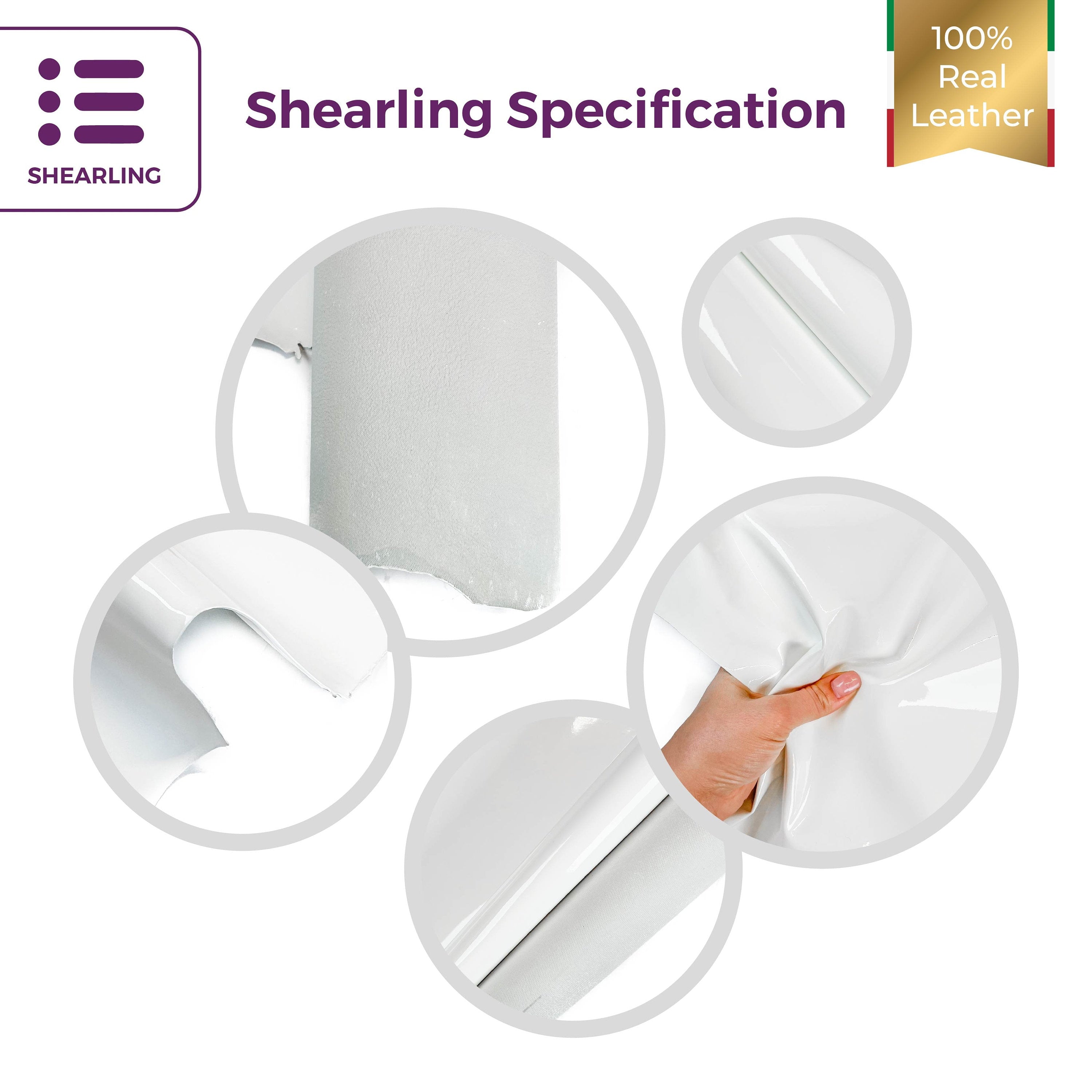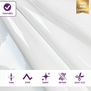 - White patent leather fabric. Faux leather hides. Shiny leather for sewing. Thick, but will hold its form. Backside is off white. Beautiful glossy finishing.