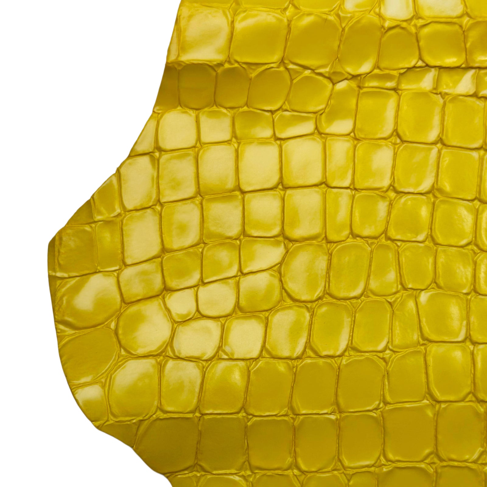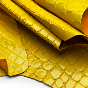 Yellow patent lambskin with embossed crocodile print. Thick sewing leather.