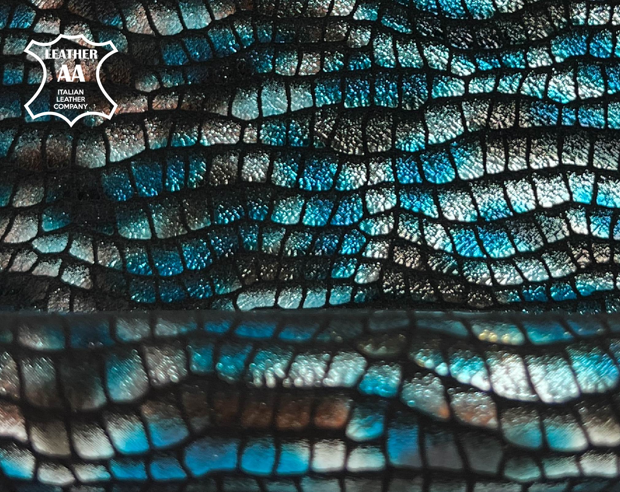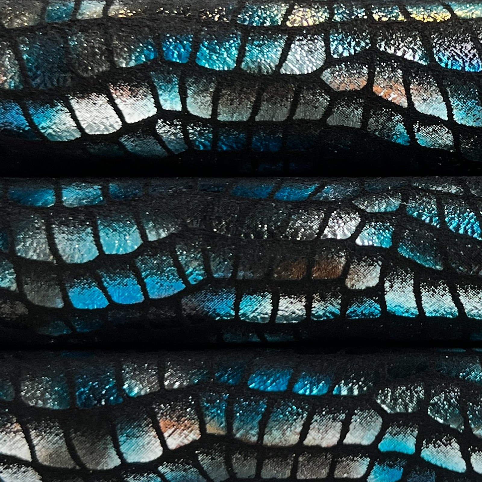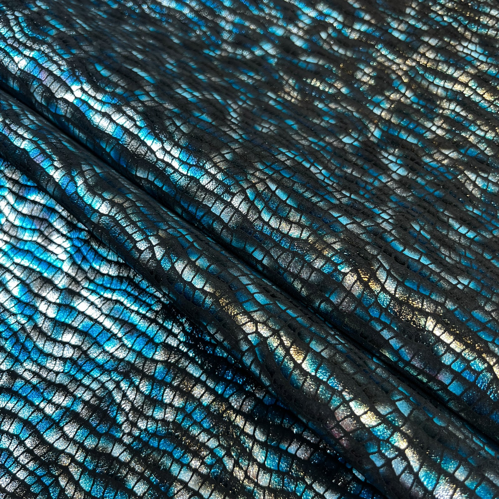Blue diamond fish print leather. Very shiny and soft metallic lambskin leather hides. Amazing leather for bag and purse crafters will be long-lasting. Our mission is to provide only the highest quality Italian leather to other leather workers, crafters of all kinds, small businesses, or shops for your own projects.