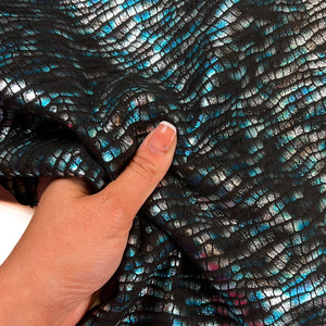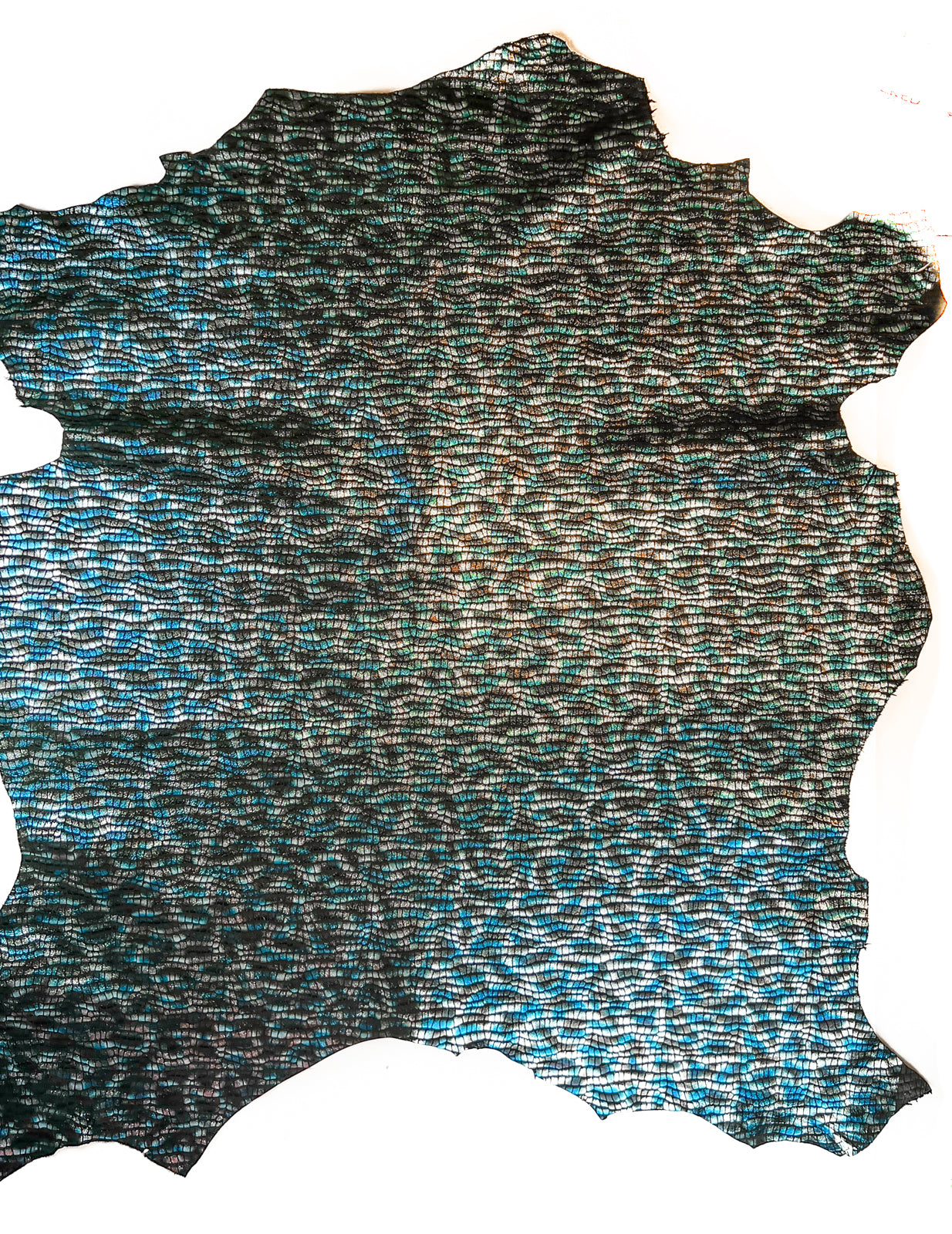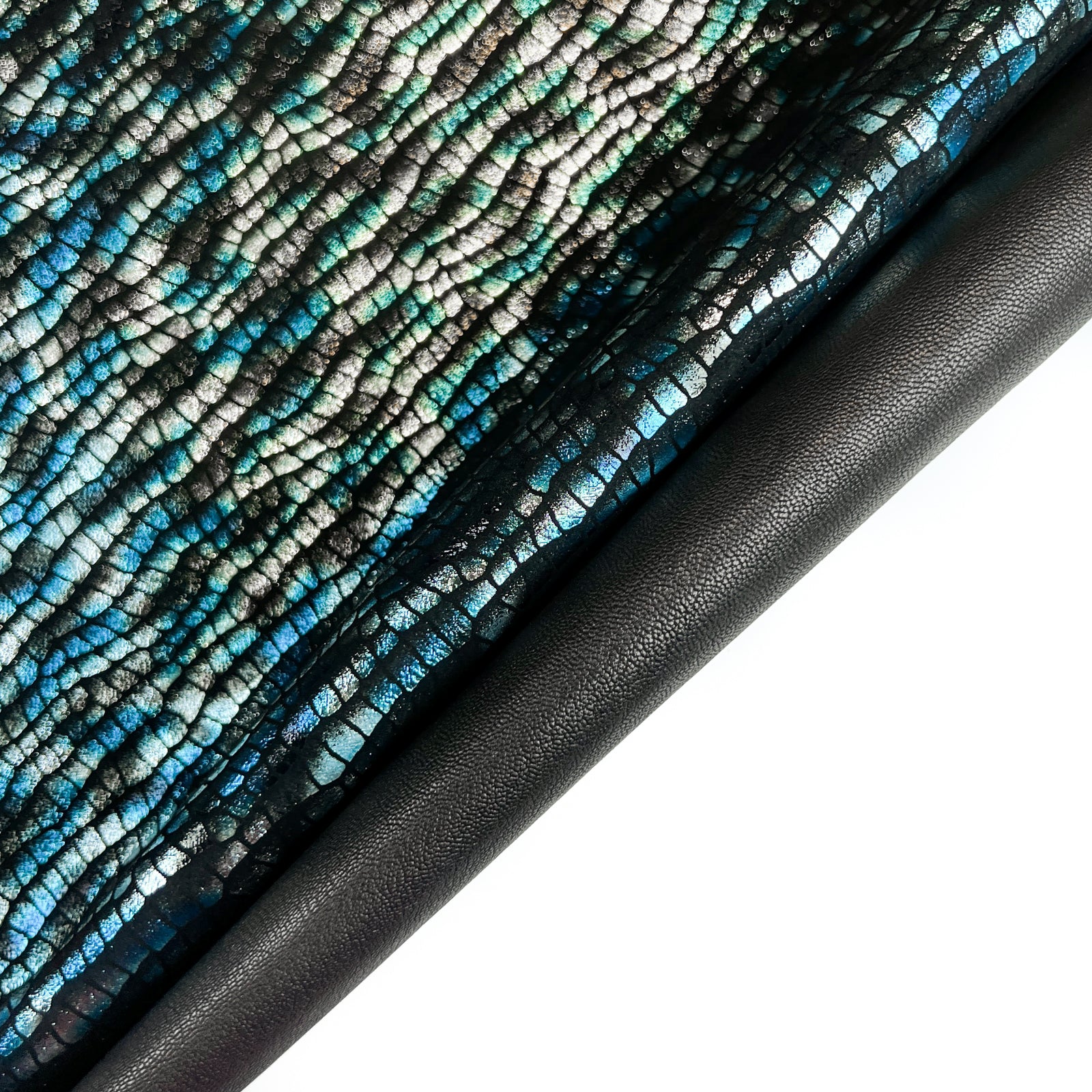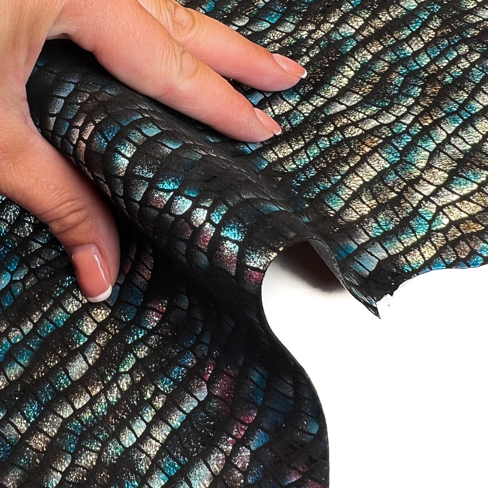 Blue diamond fish print leather. Very shiny and soft metallic lambskin leather hides. Amazing leather for bag and purse crafters will be long-lasting. Our mission is to provide only the highest quality Italian leather to other leather workers, crafters of all kinds, small businesses, or shops for your own projects.