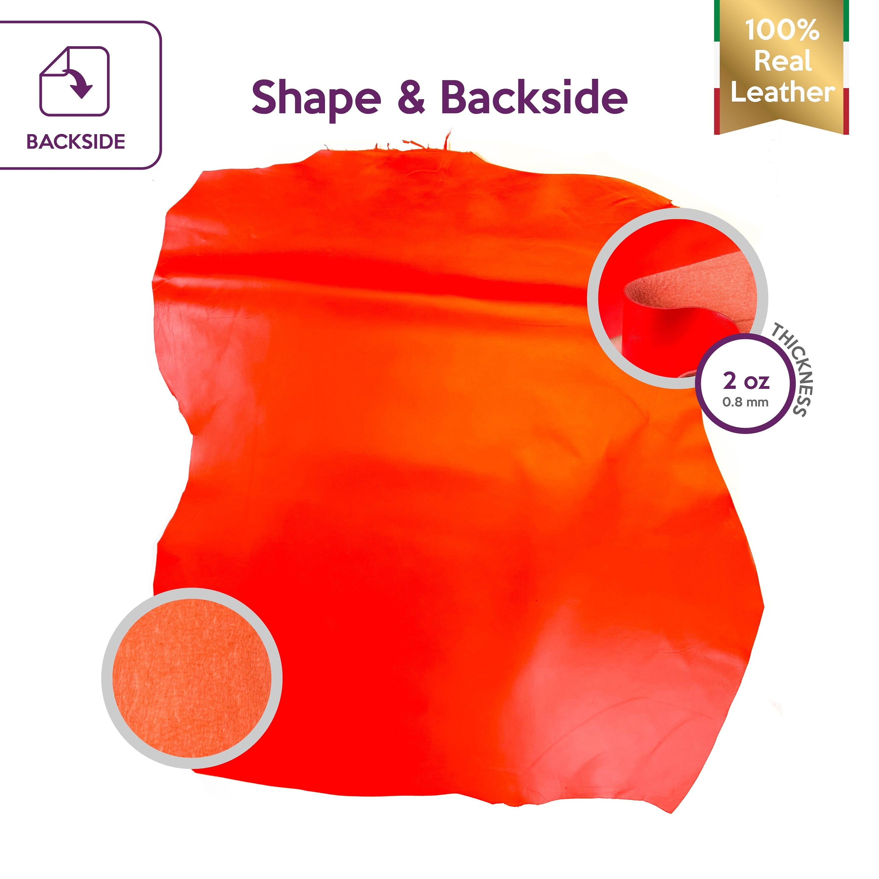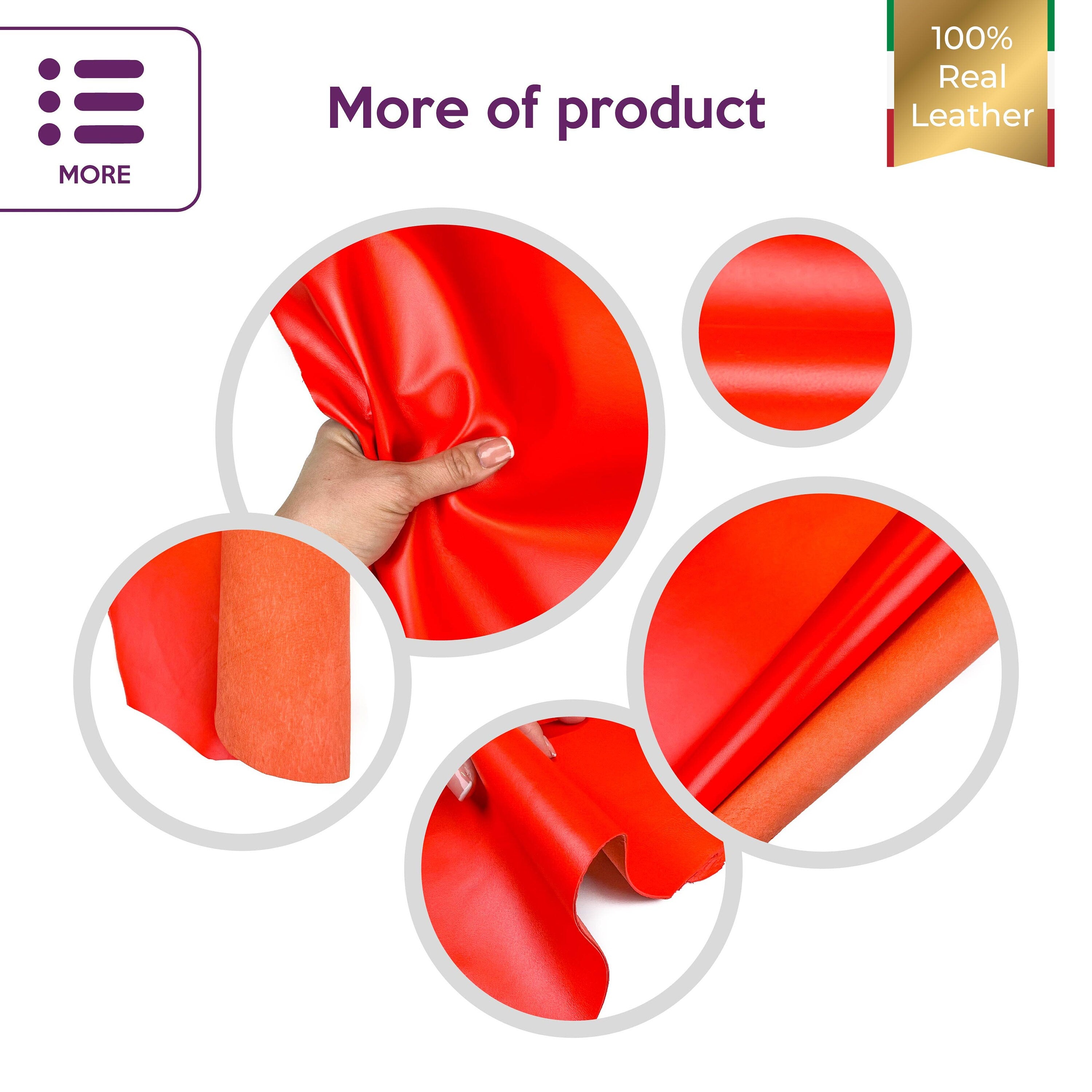 - Genuine lambskin leather in vivid colors that will impress everyone - red in one light, orange in another. Juicy, perfect for spring!The backside is dull orange. Leather is soft, pleasant to touch, and will perfectly suit both accessories and clothing. Thickness 0.8mm // 2oz