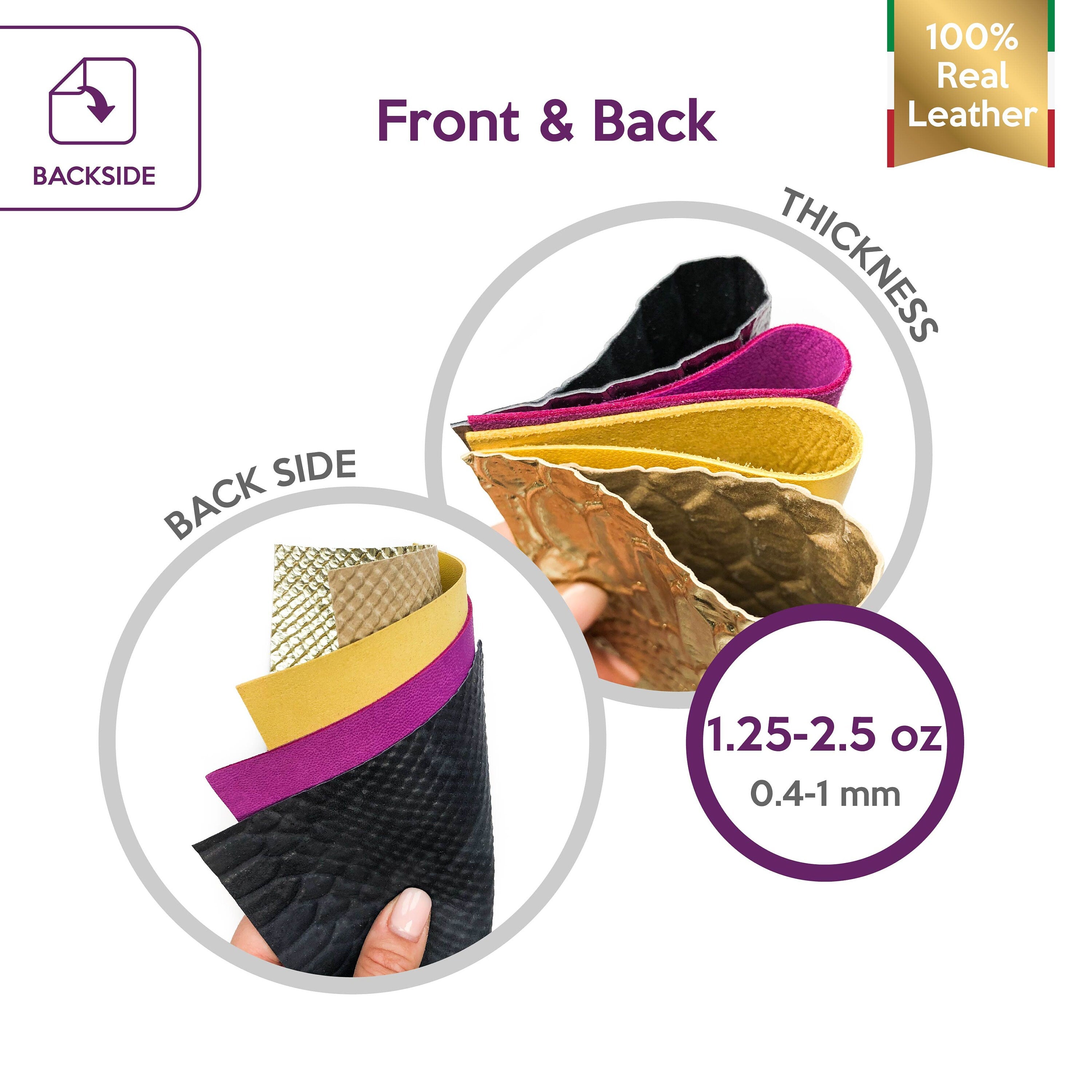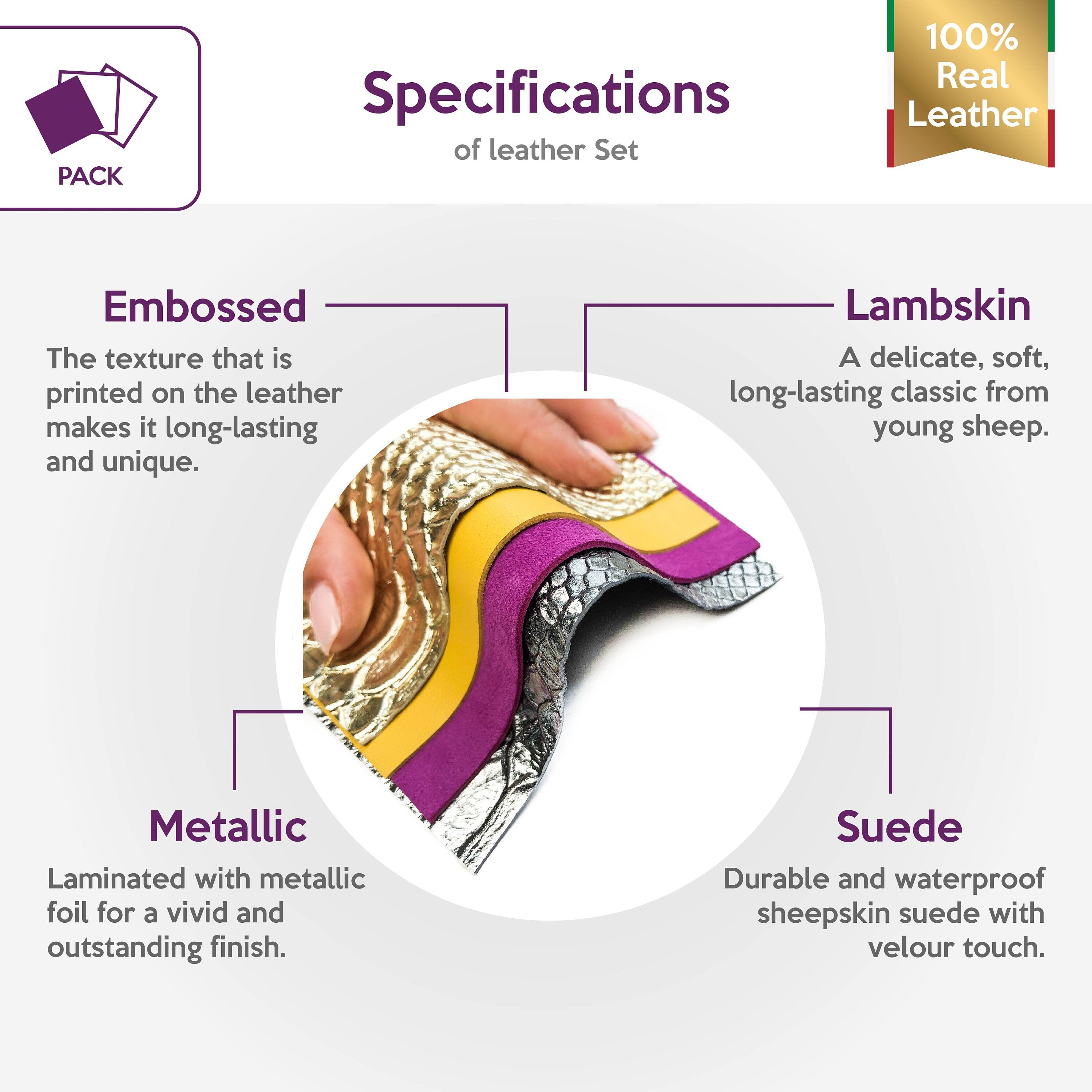 Colors: 1 yellow primrose leather sheet, 1 viola suede leather sheet, 1 metallic gold snake print and 1 metallic silver snake print.