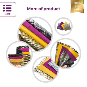 5x5 Colorful Leather SHEET PACK Genuine Animal Leather Sheets "Colorful Snake Print" ---------------------------------------------------------- WHAT YOU WILL RECEIVE FOUR Pre-cut leather Sheets : 1 yellow primrose leather sheet, 1 viola suede leather...