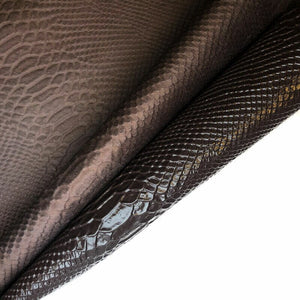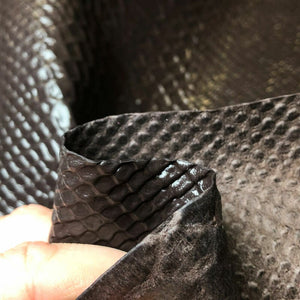 - Dark Brown leather pieces with snake texture all over the it. These pieces will be perfect as sewing supplies. Little bit stiff but very easy to work with. Leather fabric hides in beautiful classic dark brown color.