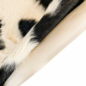 Winter season is here! Real lambskin from the best Italian tannery. Perfect leather for sewing. Fabric is extra soft and very thick. Milky white with black spots all over the leather. There may be a few little brown spots. Every single piece is unique and a little bit different because of how unlike animals are. The backside is plain lambskin.