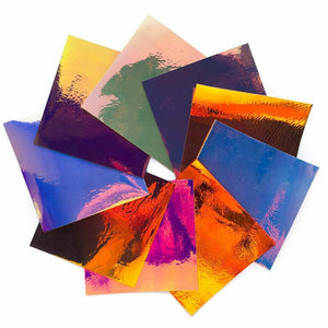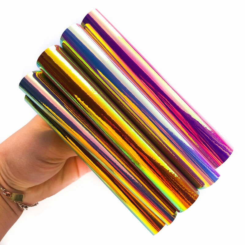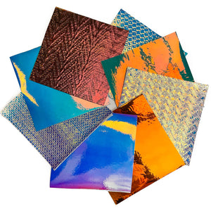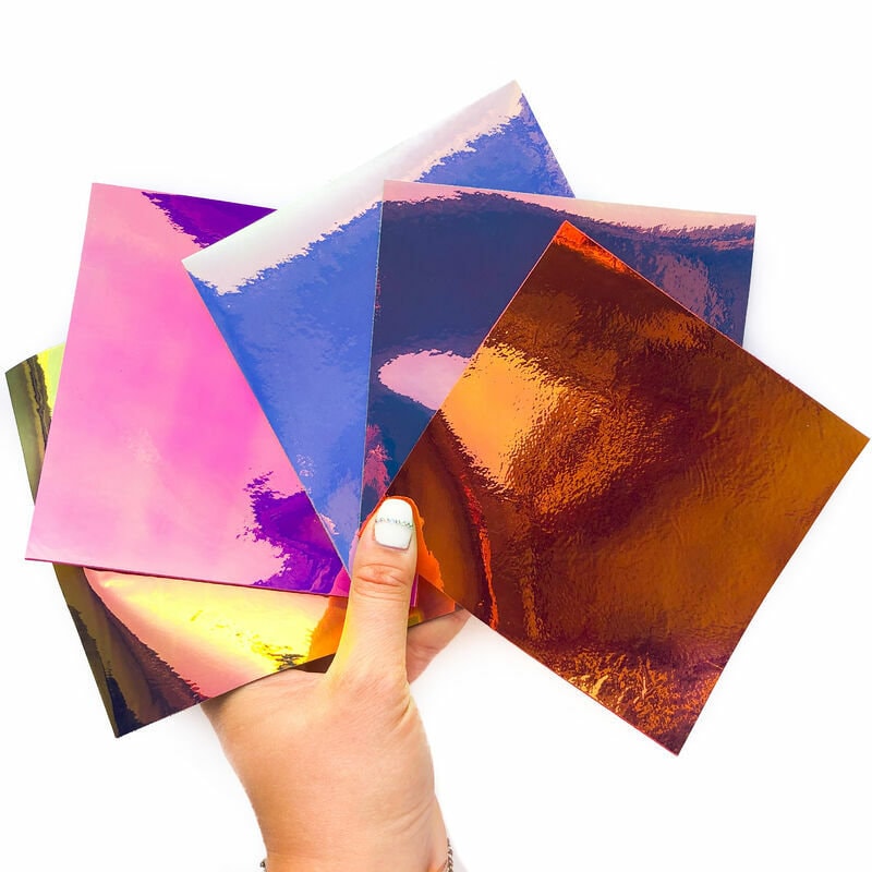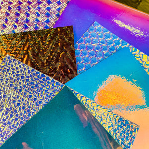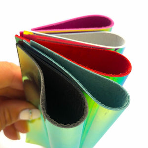 - The hologram is a trending piece in fashion! Various color hologram leather pieces. Glossy neon - gasoline holographic shades all over the sheets. Genuine lambskin scraps. The backside can be white, dark blue, red, beige. Perfect crafting pieces.