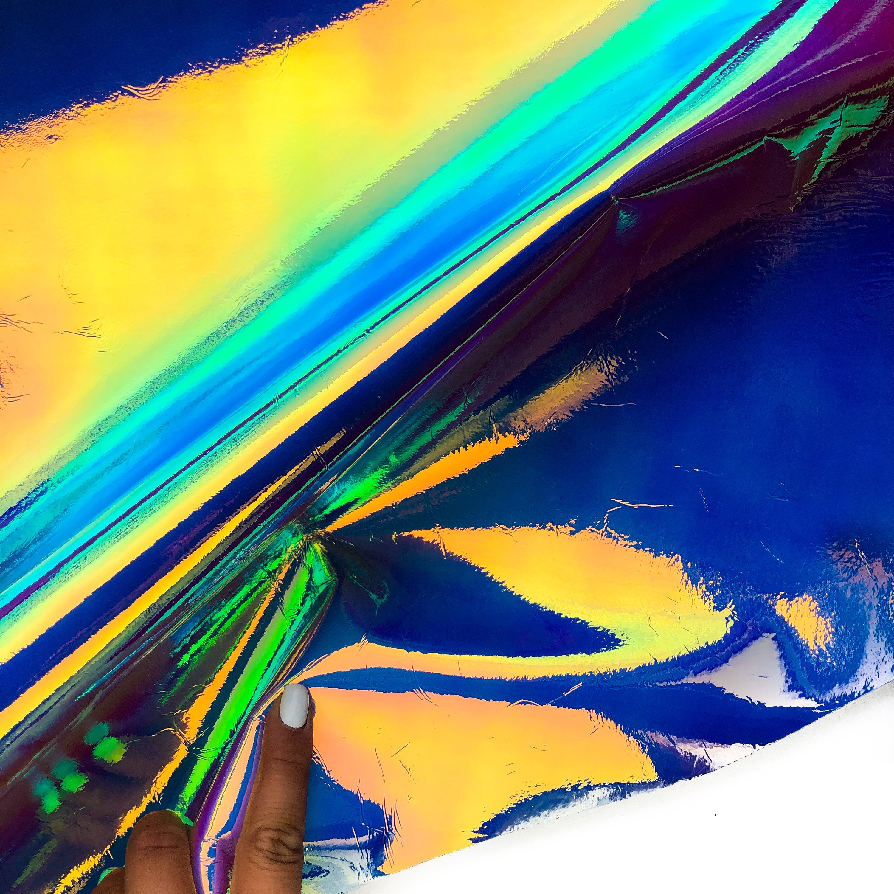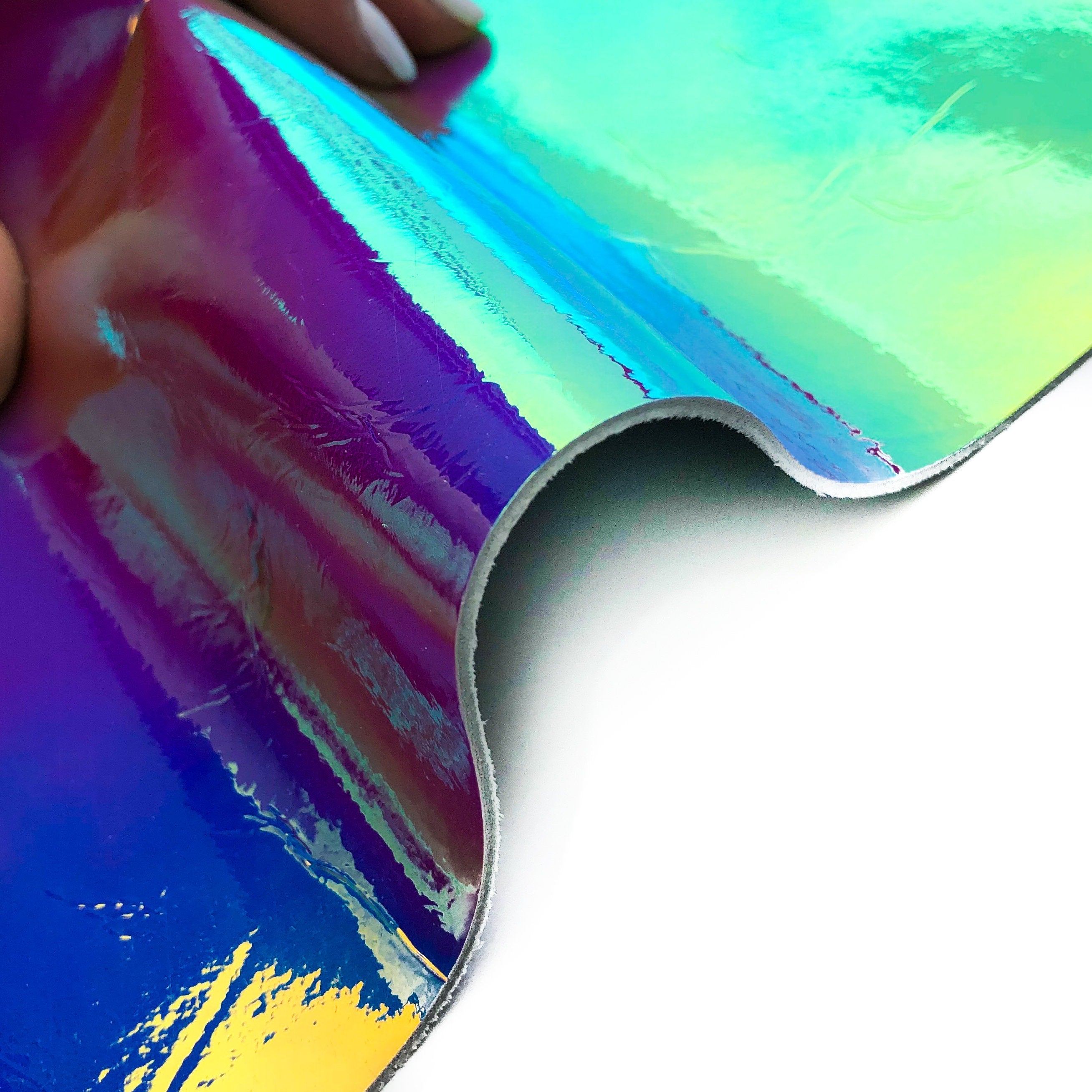 -Bright VARIOUS PURPLE & blue metallic leather is the classic of holographic colors. Mirror effect. Pretty lightweight and pleasant for touch. If folded, can leave visible marks. Backside is white.