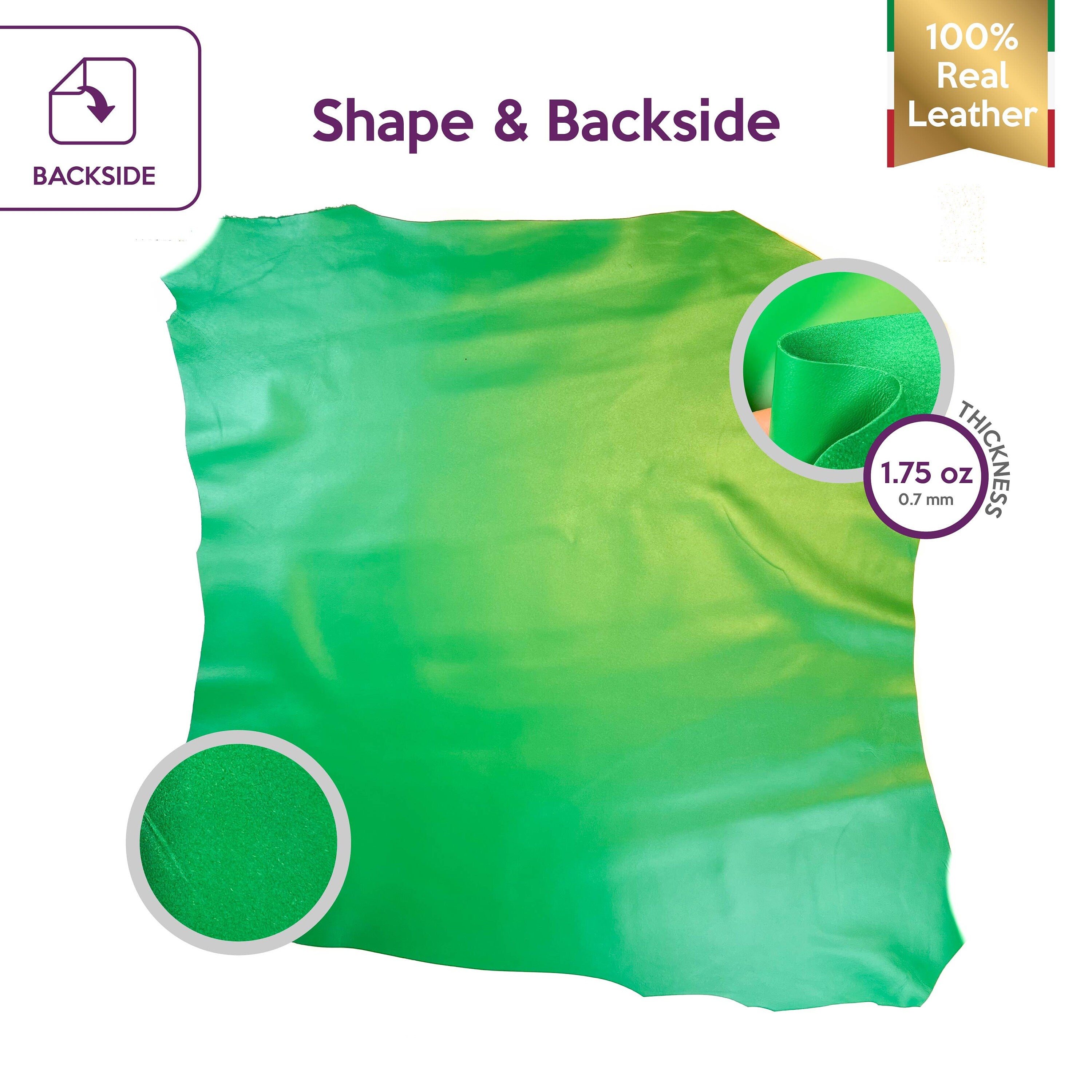 - Beautiful bright, spring-tone green lambskin leather. The backside is same as front, little bit duller. Leather is suitable for all kinds of DIY projects. Thickness 0.7mm // 1.75oz