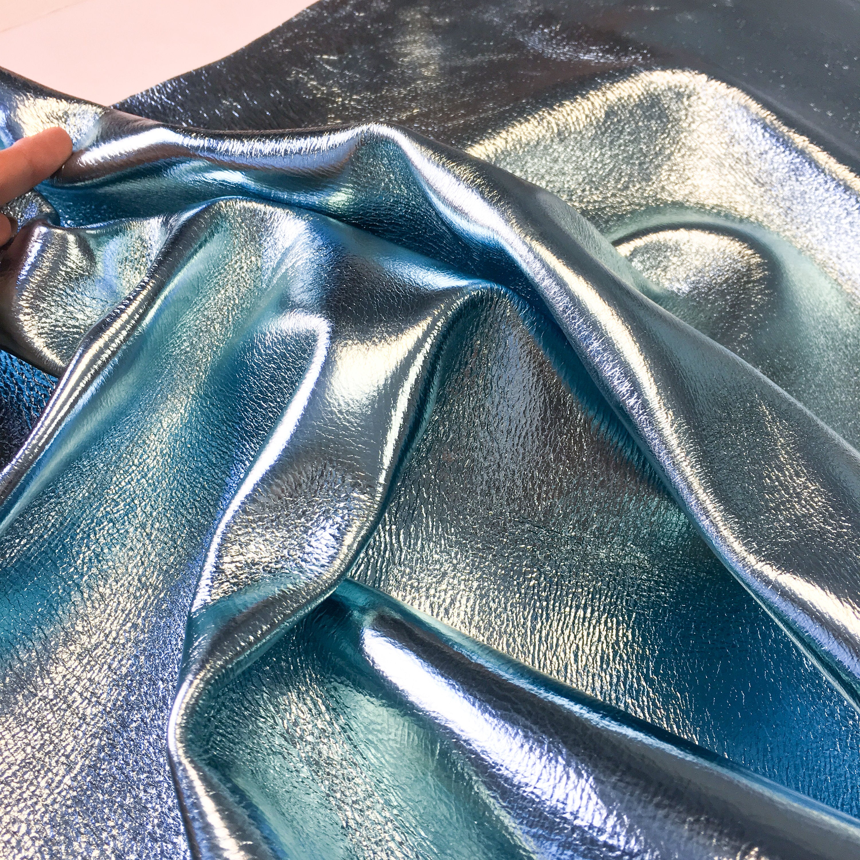 High-quality lambskin leather fabric hides in a beautiful metallic light blue color. Metallic shine all over the leather! Our mission is to provide only the best quality Italian leather samples to...