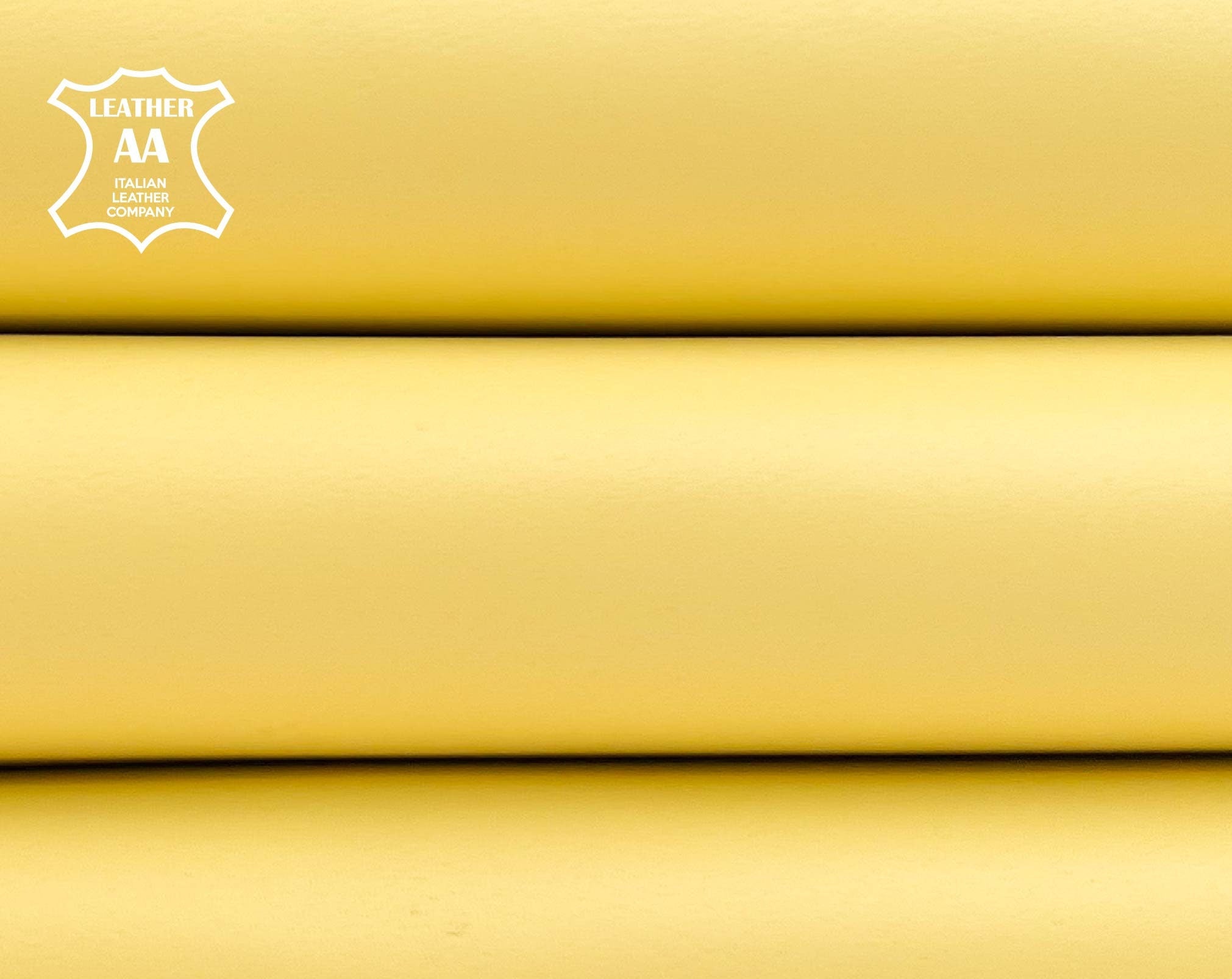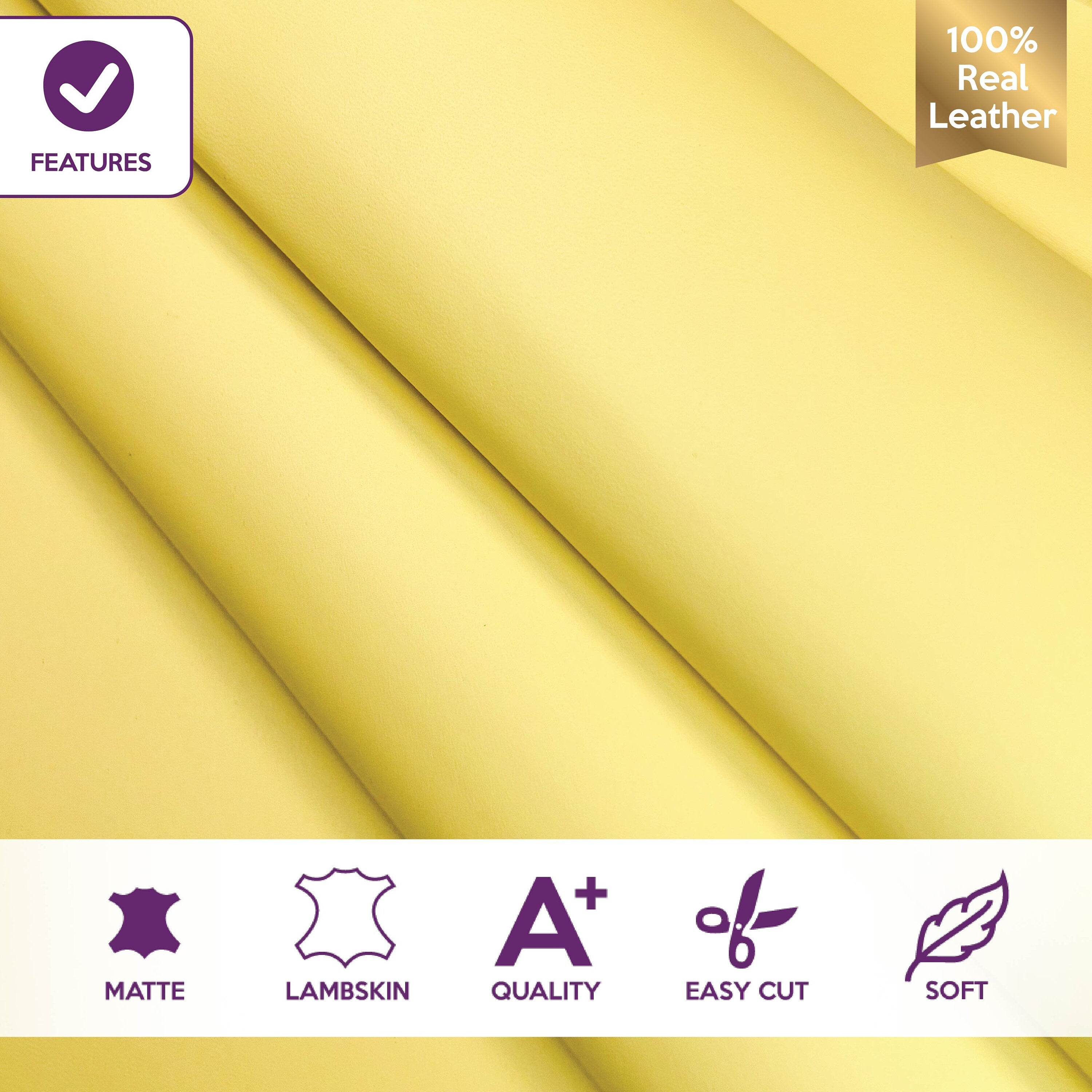 - Beautiful light pastel yellow lambskin leather hides. Leather is quite thin but will hold it's form. Perfect for leather bags. Matte yellow lambskin leather. Backside is little bit darker than front.