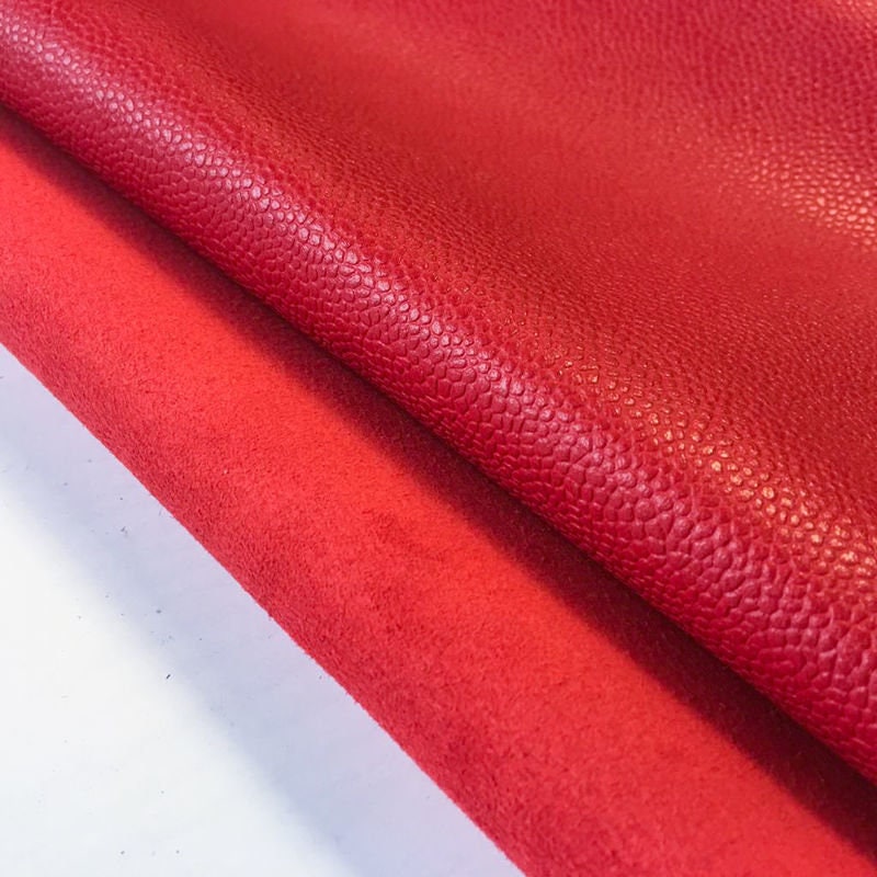-BRIGHT RASPBERRY RED textured leather fabric, colored throughout, deep coloring, bright and rich color. Quite thick but soft leather skins. Sell in full hides. Firm and high quality leather pieces. Has this little water drop texture.