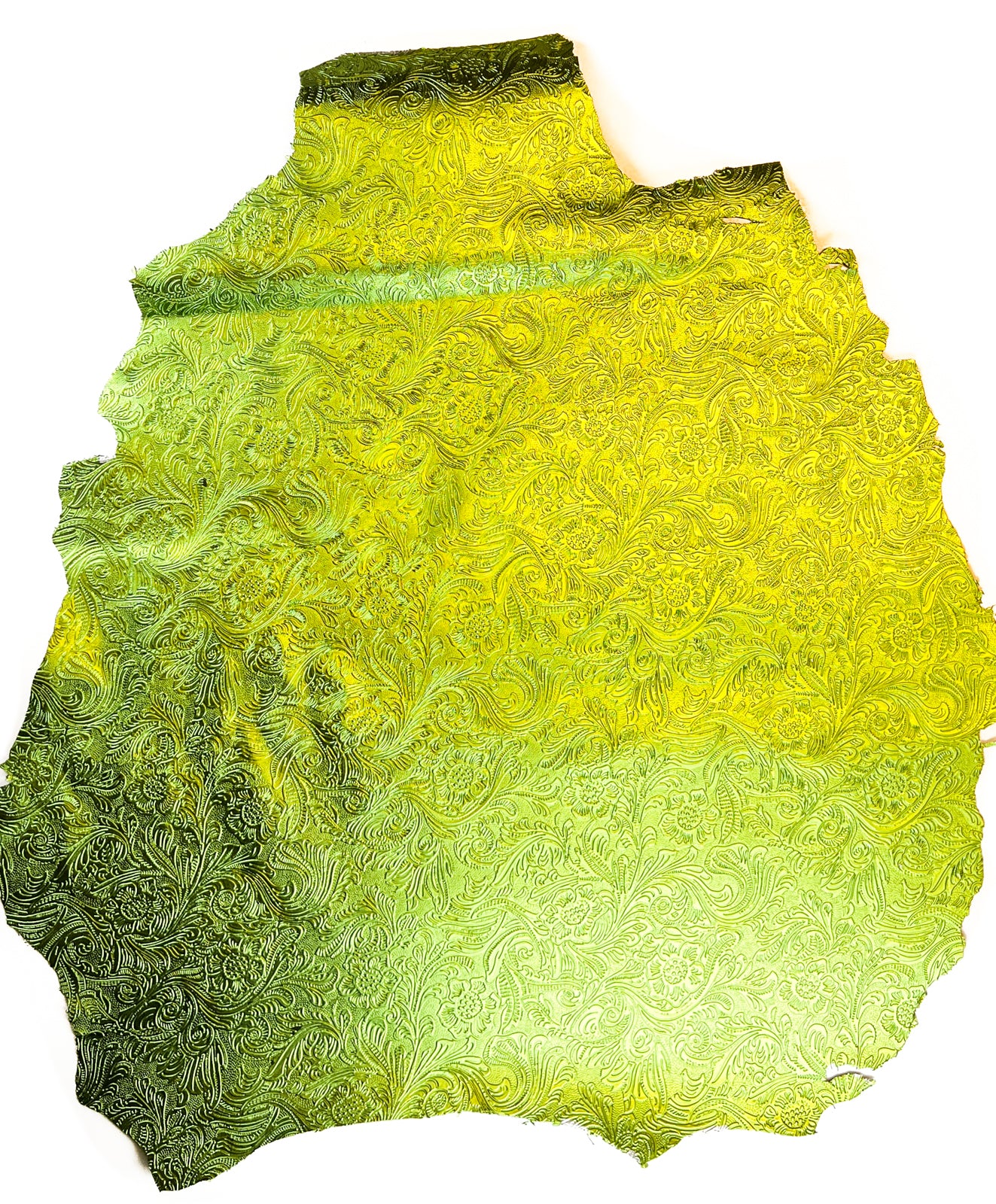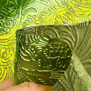 Metallic green lambskin leather with flower print. Shiny, thick hides with flower print embossing. Amazing leather for bag and purse crafters will be long-lasting. Our mission is to provide only the highest quality Italian leather to other leather workers, crafters of all kinds, small businesses, or shops for your projects.