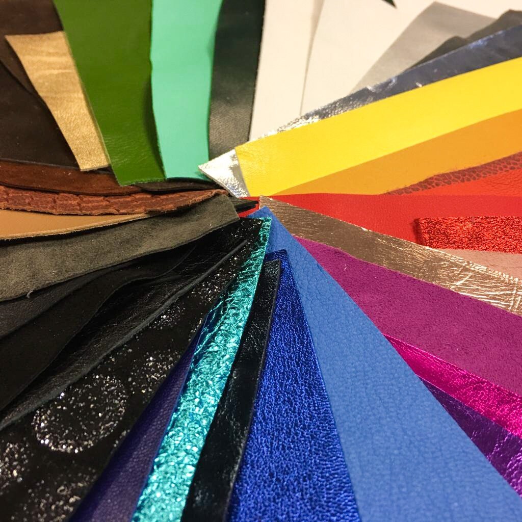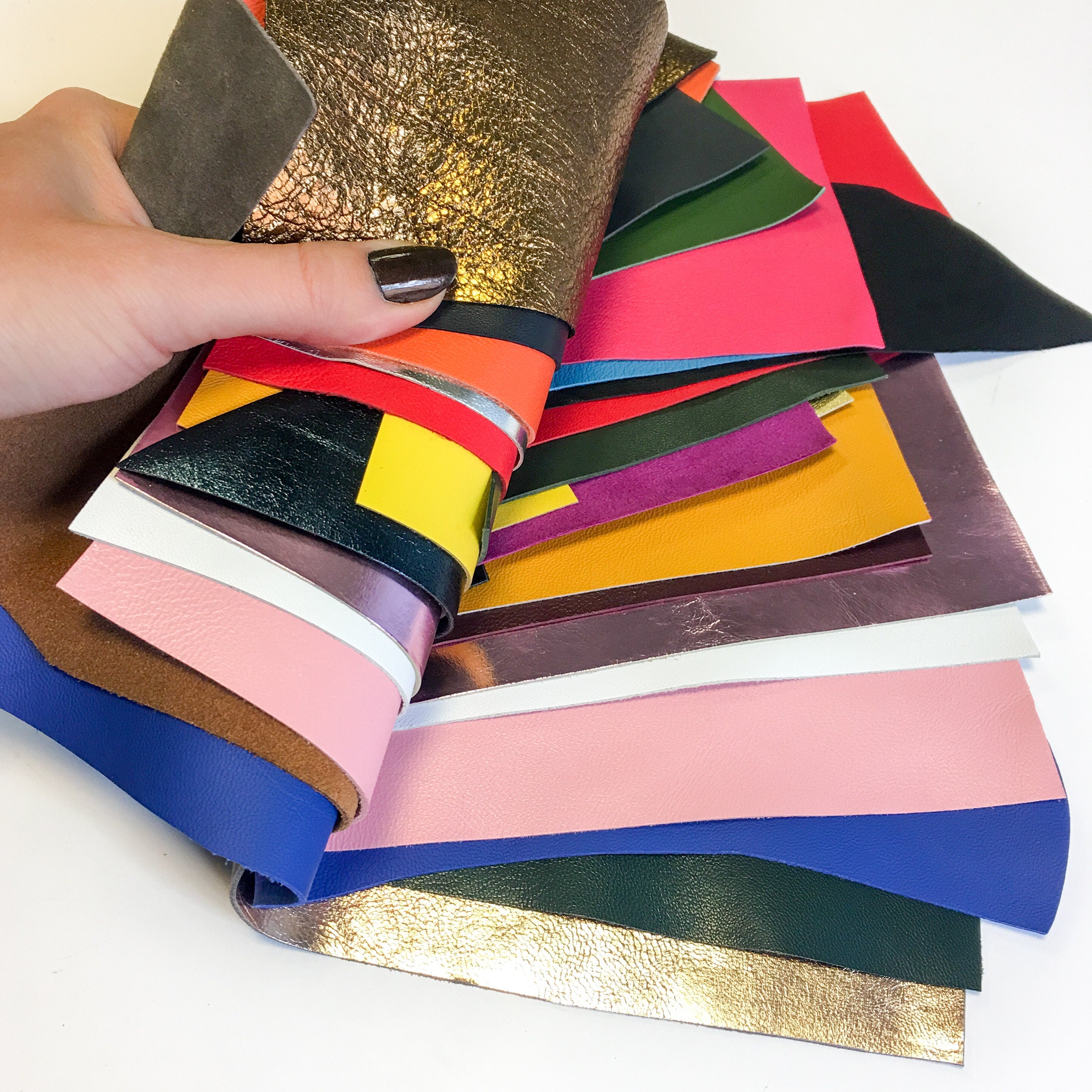 High quality lambskin leather fabric cuts in different tones. Natural leather textile scraps in different finishing. Amazing colors for your best projects!