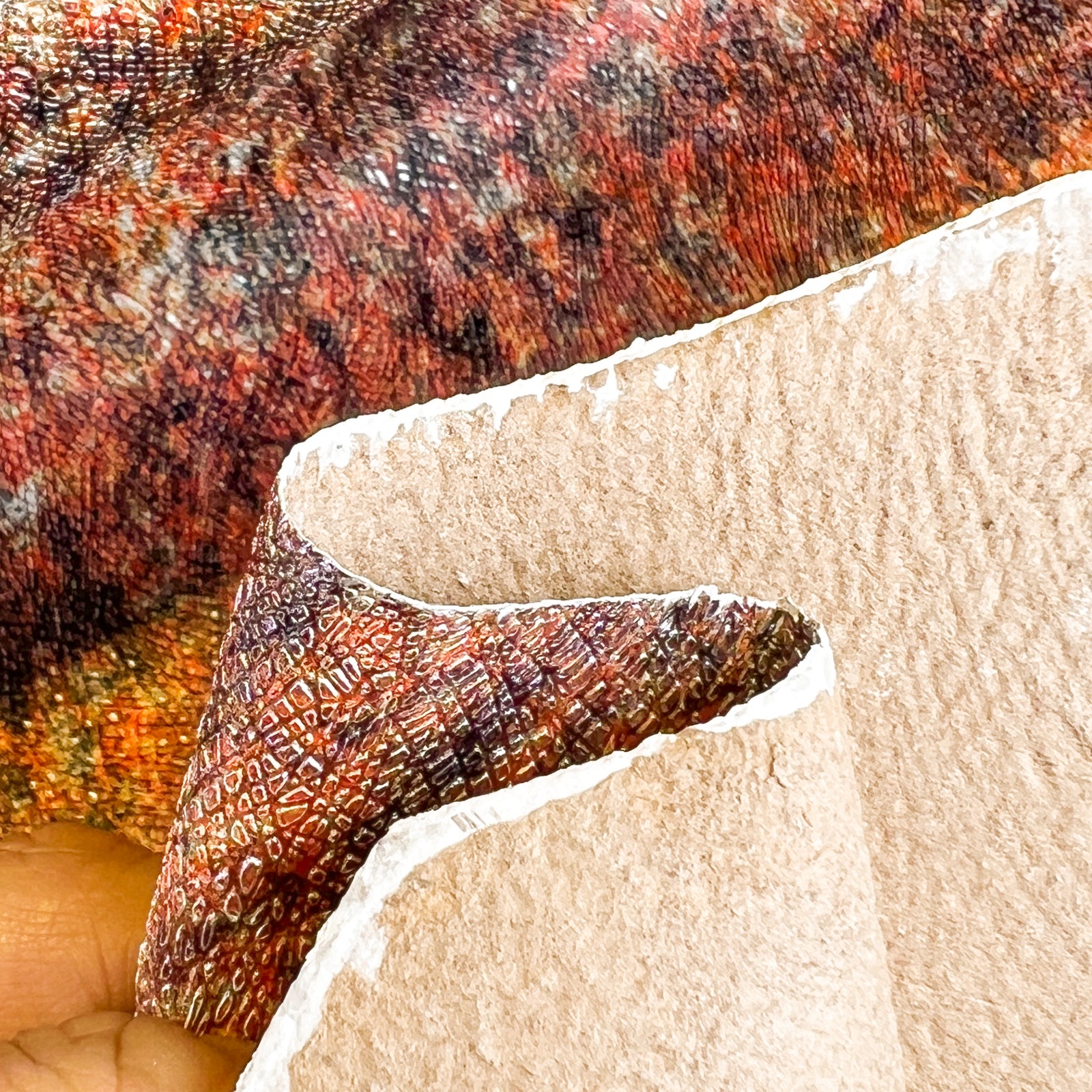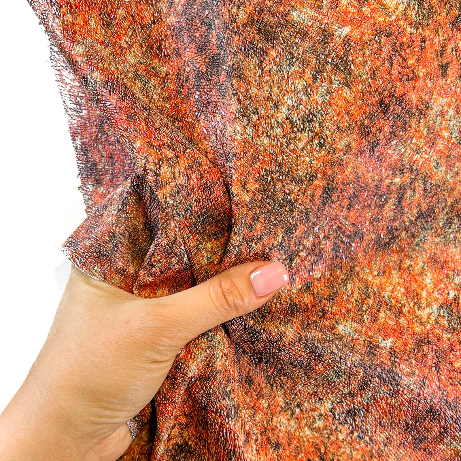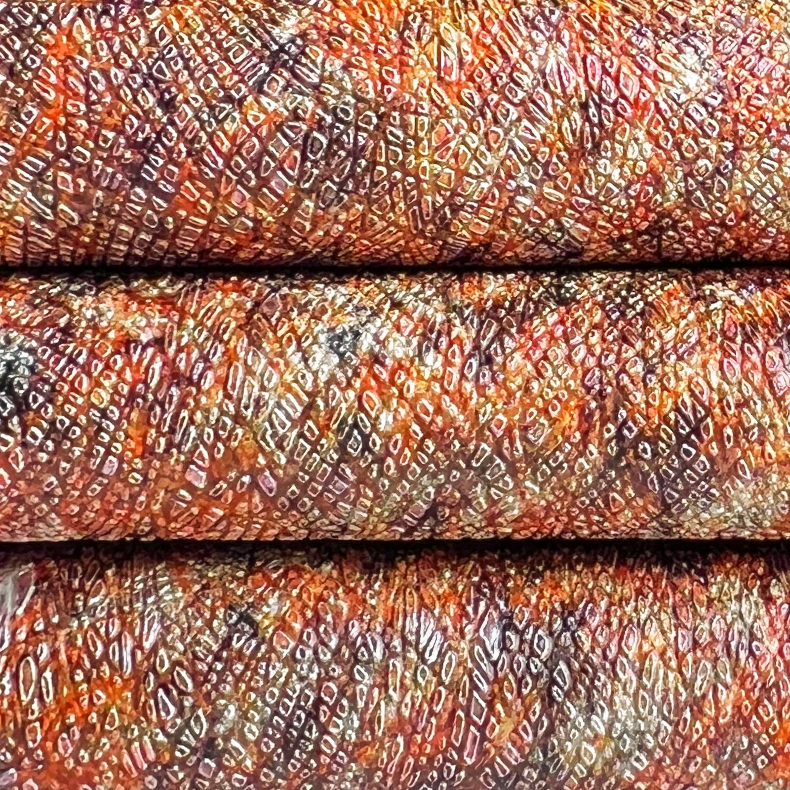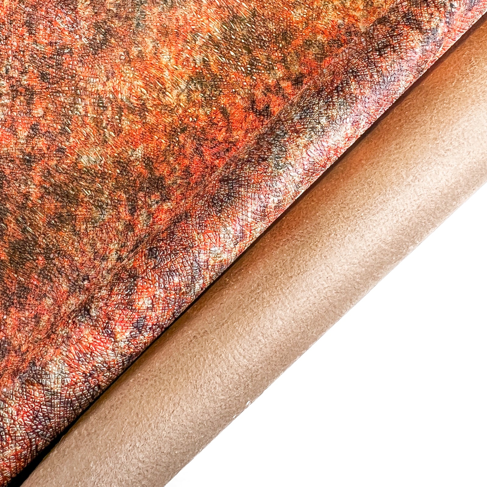 Beautiful orange lambskin pieces with mixed colors and saffiano galaxy print. Thin crafting pieces. Amazing leather for bag and purse crafters will be long-lasting. Our mission is to provide only the highest quality Italian leather to other leather workers, crafters of all kinds, small businesses, or shops for your projects.