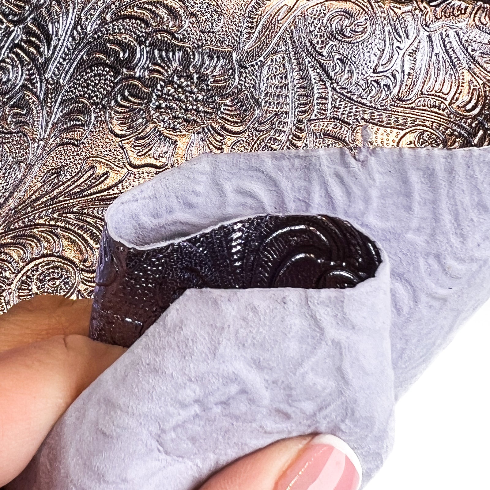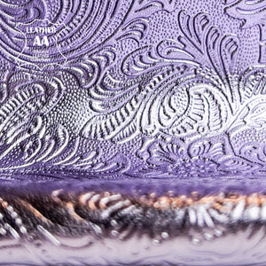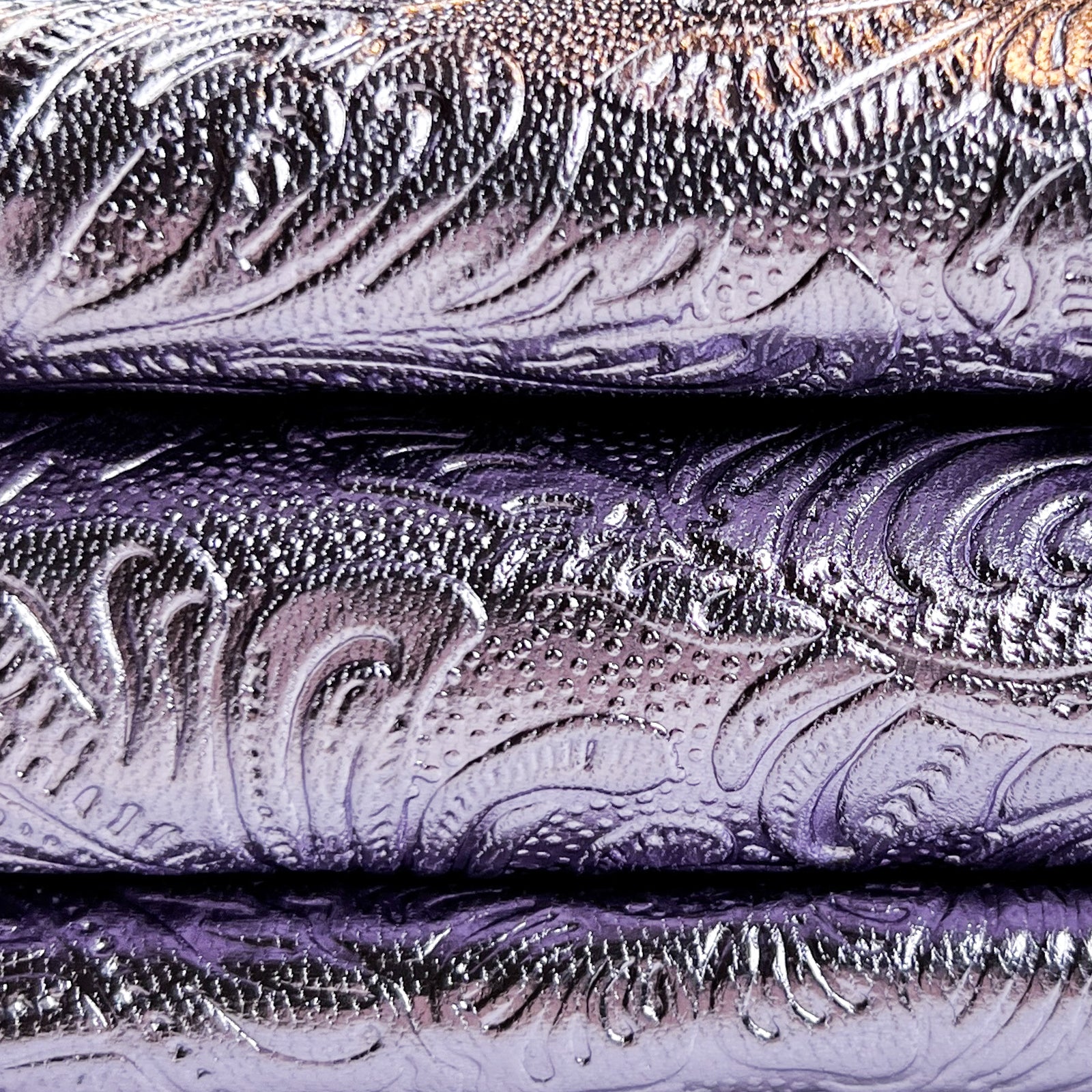 Metallic purple lambskin leather with flower print. Shiny textured hides. Amazing leather for bag and purse crafters will be long-lasting. Our mission is to provide only the highest quality Italian leather to other leather workers, crafters of all kinds, small businesses, or shops for your projects.