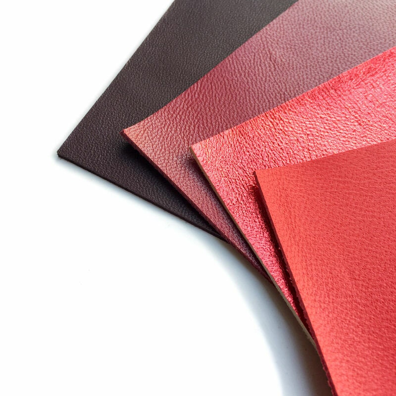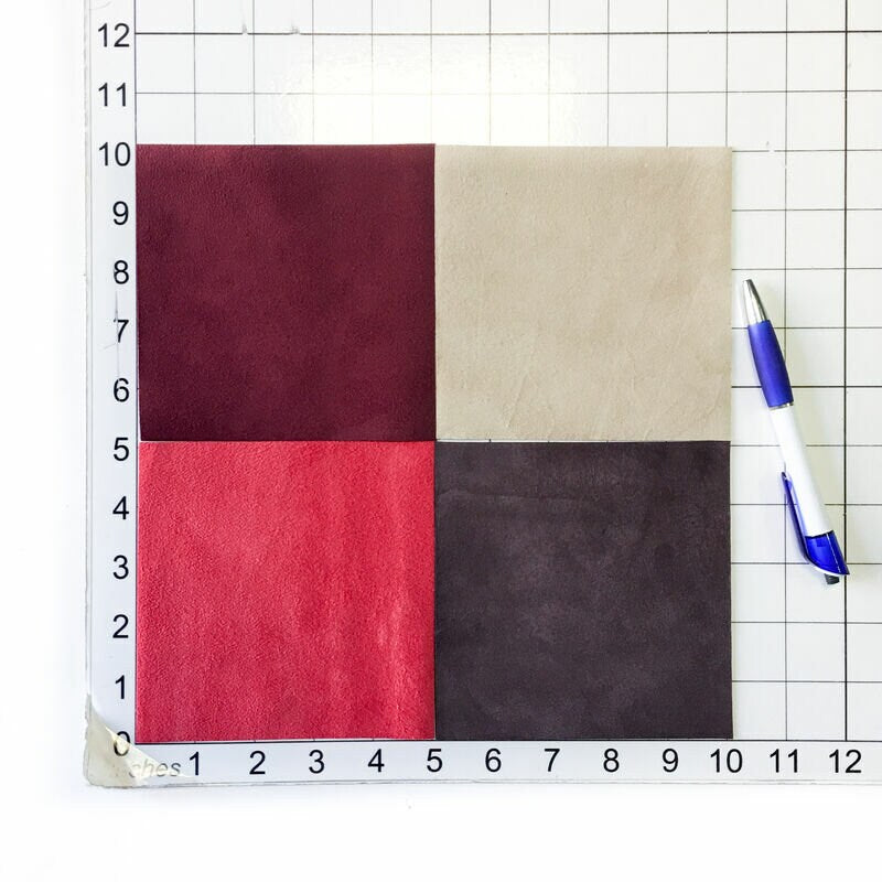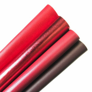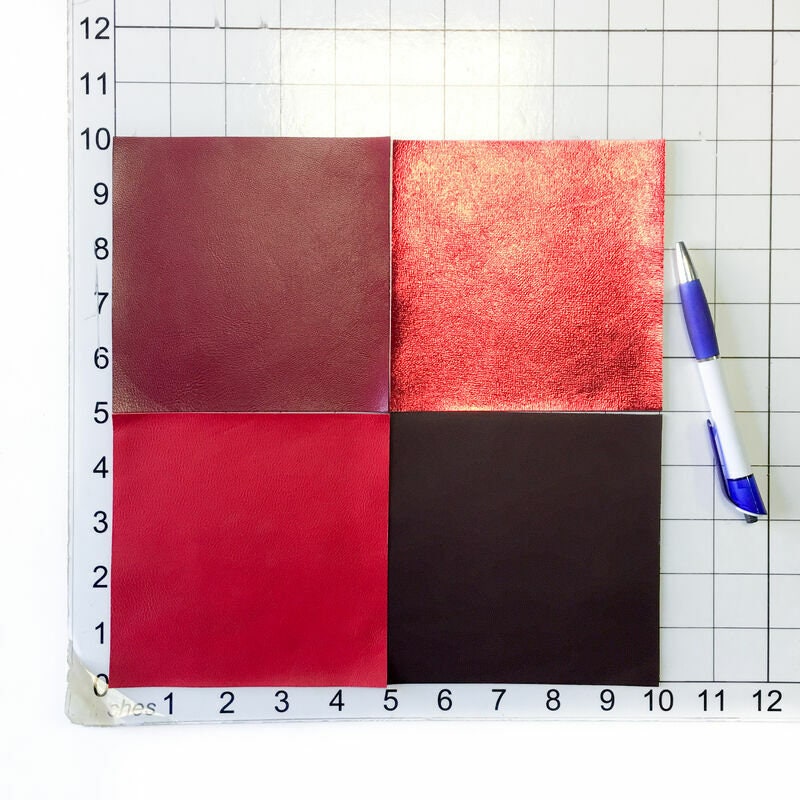 5x5 Red Shades SHEET PACK Genuine Animal Leather Sheets "Red Shades Set" ---------------------------------------------------------- WHAT YOU WILL RECEIVE FOUR Pre-cut leather Sheets : 1 metallic ruby red, 1 bright racing red leather...