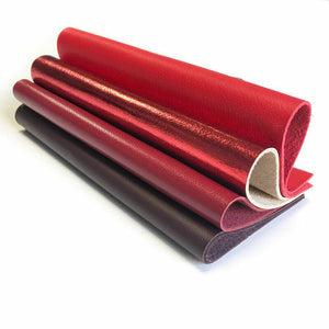 FOUR Pre-cut leather Sheets : 1 metallic ruby red, 1 bright racing red leather piece, 1 spisy chili red and 1 port royal sheet.