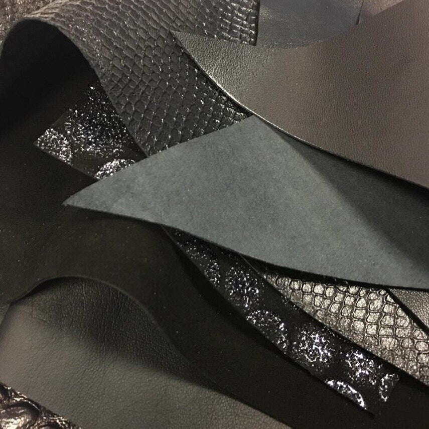 Material and color: different kind of blacks - nappa, suede, textured, leather print, shinny, matte, may contain some printed leather pieces according to what we have in stock at that moment