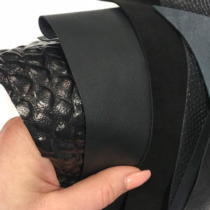 Black Genuine Sheep Skin Leather Pieces. Natural, soft black leather scraps in different finishing. Quite thin, soft, Italian made A grade leather material for crafts. Includes black suede, metallic leather, textured black leather sheets.