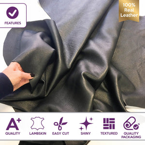 -Black leather with visible texture. Bit shiny, not too stiff. Soft to touch, perfect for clothing - jackets, blazer etc.