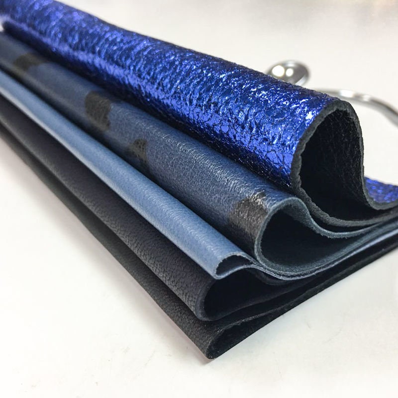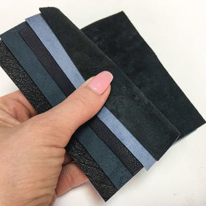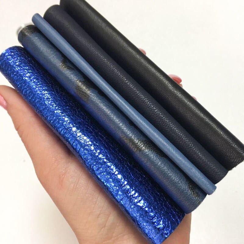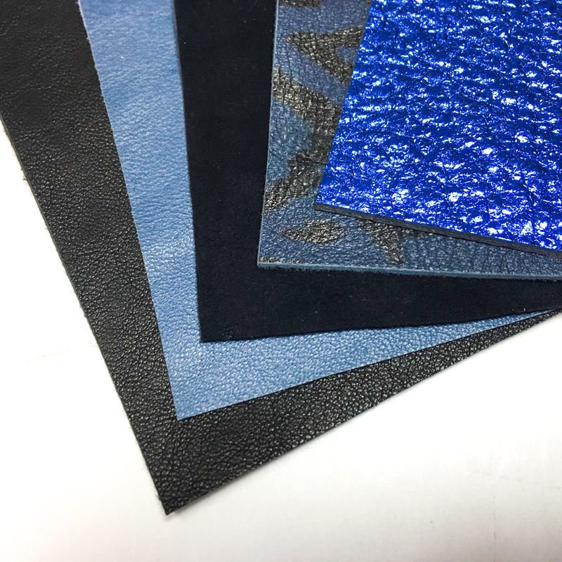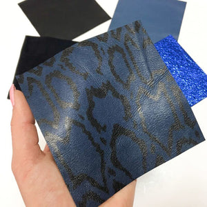 BLUE SNAKE is metallic leather and leather print mix, FREE Shipping. 5 different pre-cut dark and shiny blue leather samples: ultra dark blue suede, thin real teal piece, teal blue snake print, royal blue sparkles, black piece. Mix quality lambskin metallic leather sheets, 5 pieces, 5x5 inches (12.5x12.5 cm). Perfect leather for crafts.