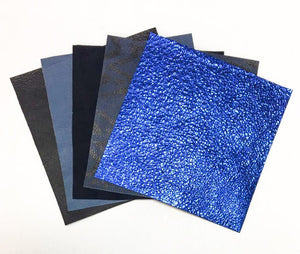 5x5 INCH BLUE SNAKE SHEET MIX Genuine Sheep skin sheets, pre cut leather sheets "BLUE SNAKE" BLUE SNAKE is metallic leather and leather print mix, FREE Shipping. 5 different pre-cut dark...