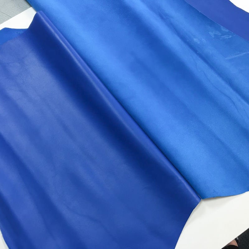 -INK Blue leather sheets. Real animal skin pieces for sewing and handcrafting. Bright Blue leather fabric. Pleasant for touch, will hold the shape of Your product, but it; s not stiff. Colored through-out. Try it!