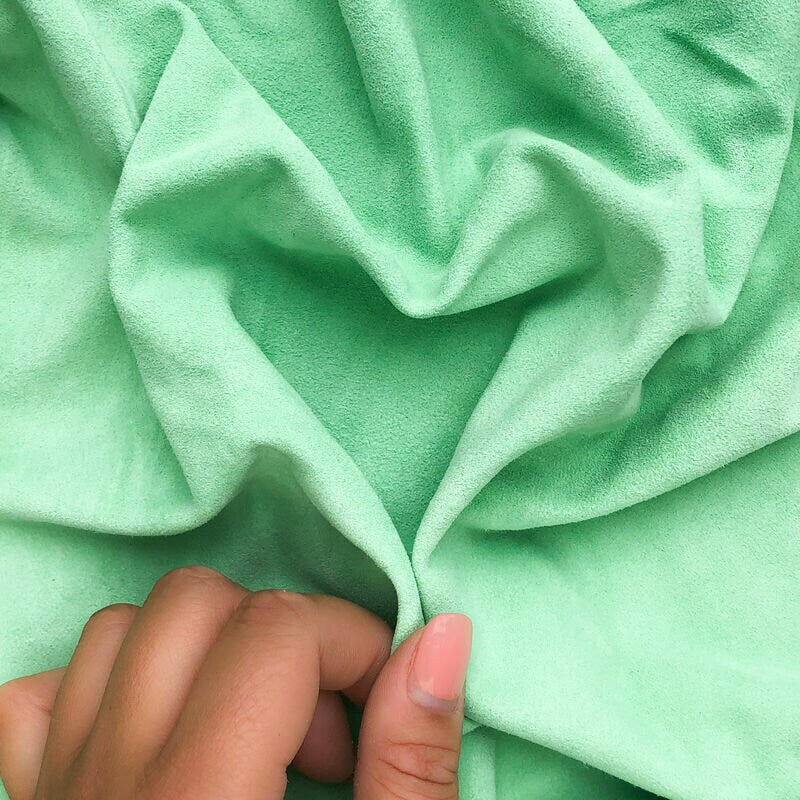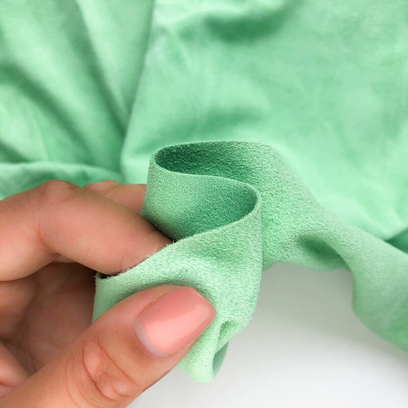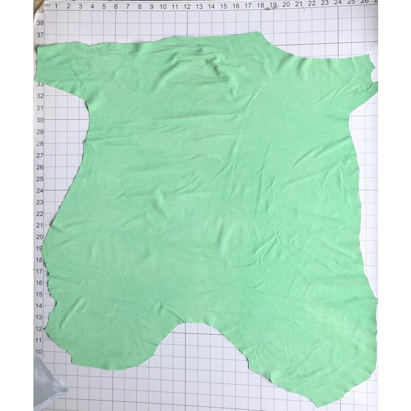 - Soft green suede leather hides for sewing. Soft, pleasant velour material. Colored throughout - back is the same color as front. Leather hides are very thin and easy to work with.